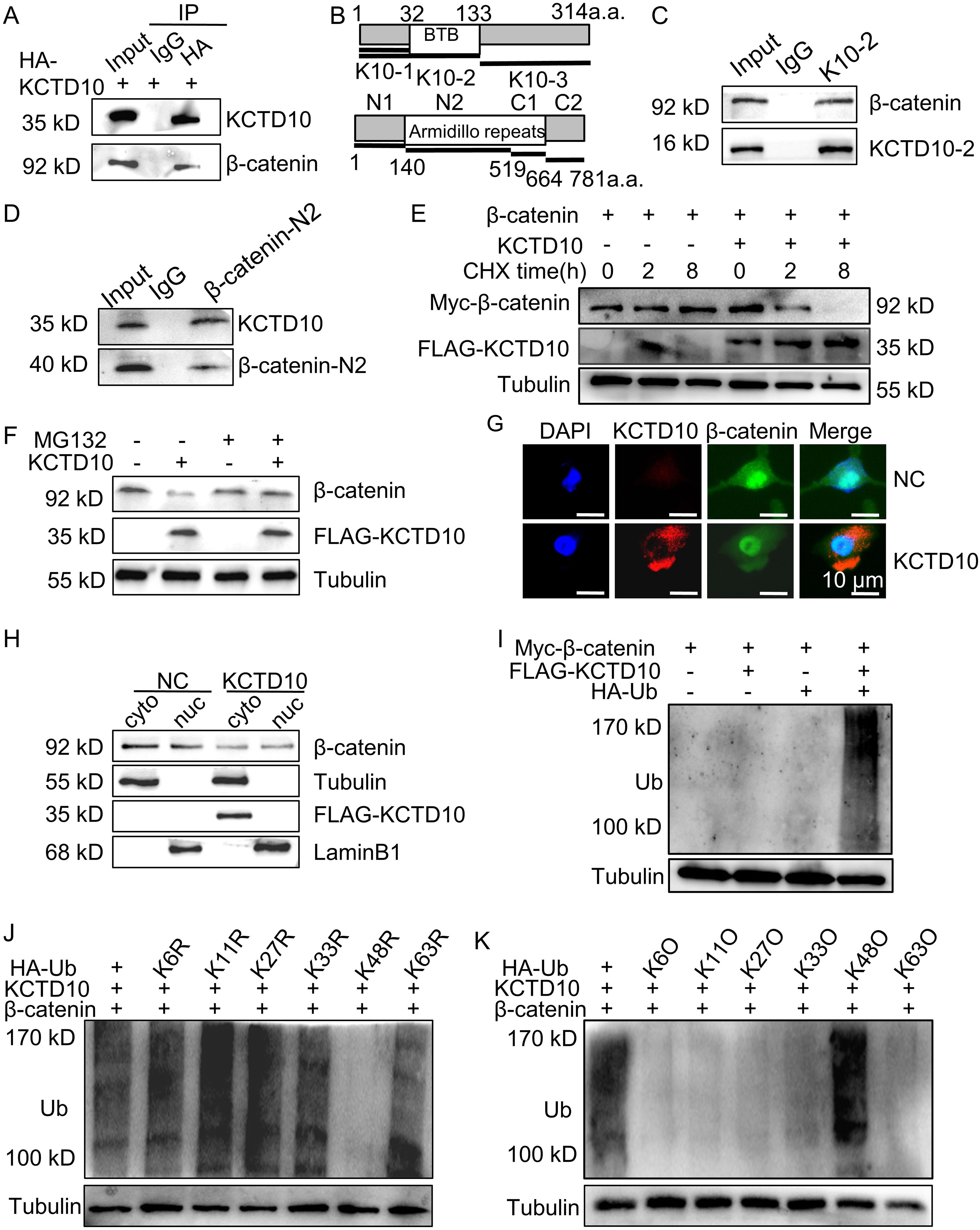 Figure 4. KCTD10 promotes ubiquitination and degradation of β-catenin through the K48-ubiquitin chain. (A) Co-IP analysis demonstrating the interaction between KCTD10 and β-catenin proteins. (B) Representative schematic of KCTD10 and β-catenin protein domains. (C, D) Identification of the interacting regions between truncated KCTD10 and β-catenin proteins. (E) Degradation of β-catenin proteins after CHX treatment. (F) Effect of KCTD10 on β-catenin protein stability in the presence of MG132. (G, H) Fluorescence analysis and Western blots showing KCTD10-induced degradation of cytoplasmic β-catenin. (I–K) KCTD10 overexpression enhanced the ubiquitination of β-catenin. Myc-β-catenin was immunoprecipitated with rabbit polyclonal anti-β-catenin antibodies and these immunocomplexes were subjected to Western blotting with anti-ubiquitin antibodies to detect β-catenin-ubiquitin conjugates. In the ubiquitin constructs, R indicates that the corresponding lysine residue has been mutated to arginine, abolishing linkage at that site; O indicates that only the corresponding lysine residue remains intact, while all other lysines are mutated, allowing selective assessment of linkage through that specific site.