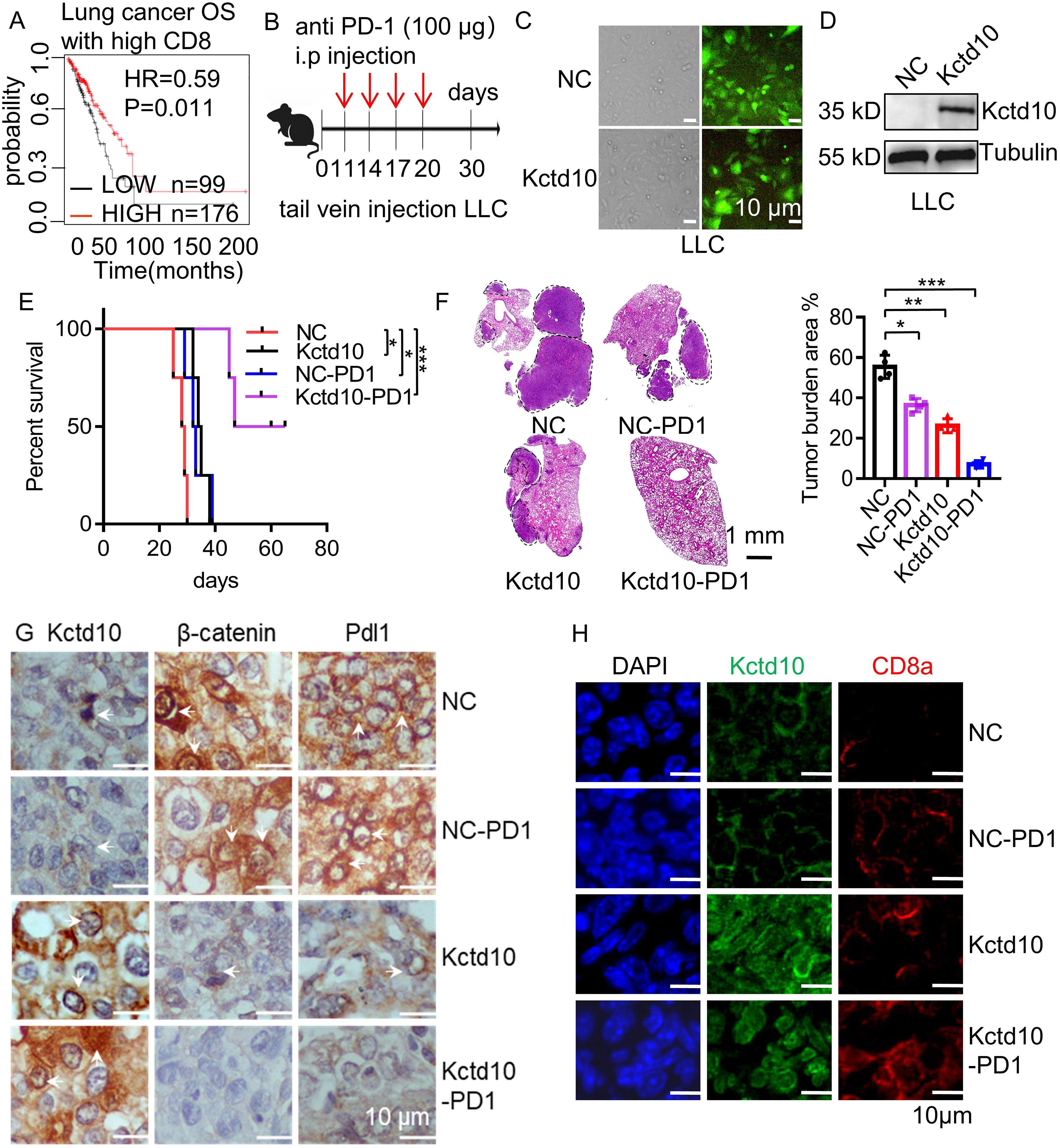Figure 5. Overexpression of Kctd10 combined with anti-PD-1 therapy effectively suppresses lung tumor colonization. (A) Effect of Kctd10 expression on patient survival in high CD8 expression cohorts. (B) Combined therapeutic strategy for LLC tumors inoculated into C57BL/6 mice. (C, D) Construction and validation of stable LLC cell lines overexpressing Kctd10. (E, F) Effect of Kctd10 and anti-PD-1 therapy on lung tumor size and survival in LLC-bearing mice (n=4/group). (G) IHC analysis of β-catenin and Pd-l1 proteins expression following Kctd10 overexpression and anti-PD-1 treatment. (H) IF analysis of CD8a proteins expression following Kctd10 overexpression and anti-PD-1 treatment. *P < 0.05, **P < 0.01, ***P < 0.001.