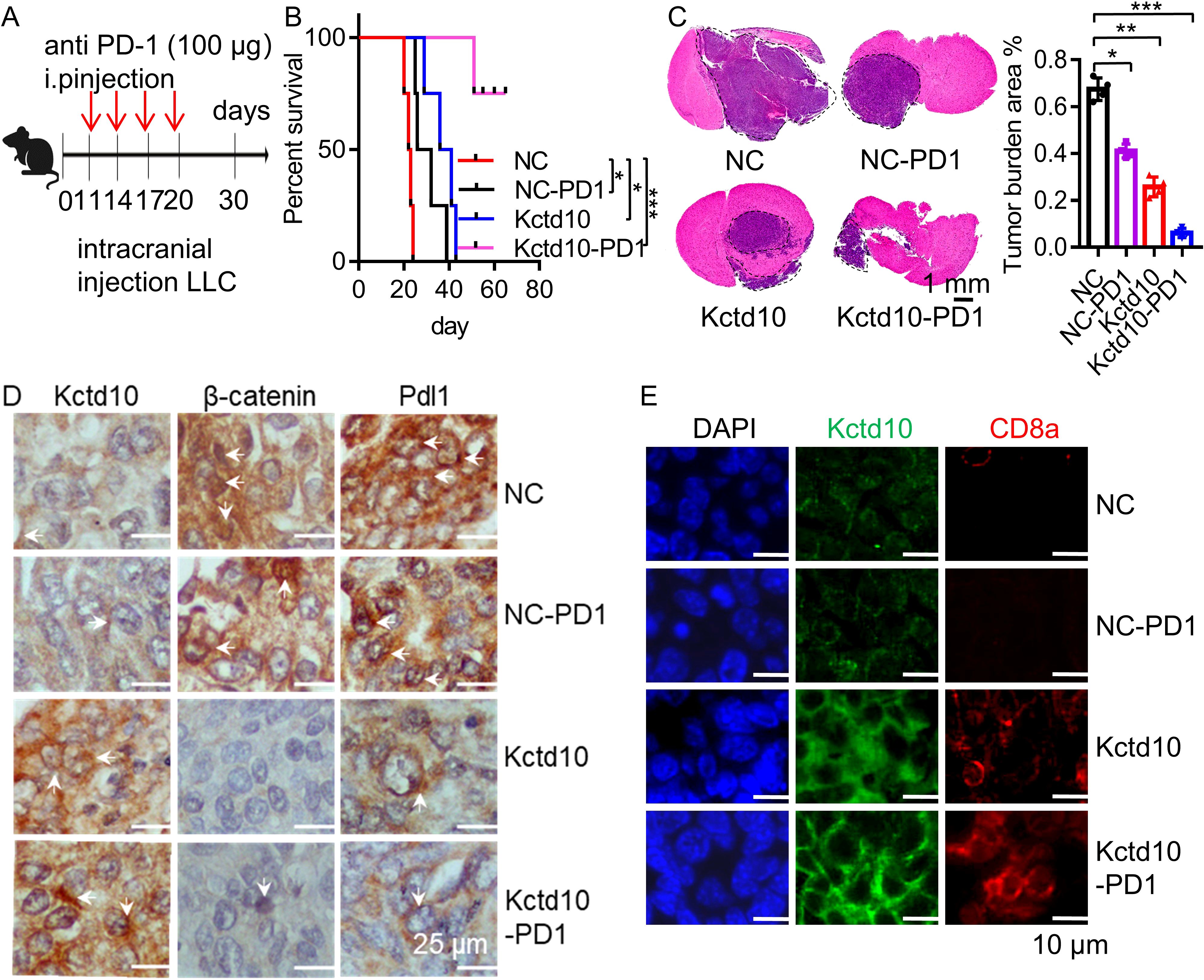 Figure 6. Kctd10 in combination with anti-PD-1 therapy suppressed lung cancer brain metastasis. (A) Combined strategy for intracranial LLC metastatic tumor treatment in C57BL/6 mice. (B, C) Effects of Kctd10 and anti-PD-1 therapy on intracranial tumor sizes and survival in LLC-bearing mice (n=4/group). (D) IHC analysis of β-catenin and Pd-l1 proteins following Kctd10 overexpression and anti-PD-1 therapy. (E) IF analysis of CD8a proteins following Kctd10 overexpression and anti-PD-1 therapy. *P < 0.05, **P < 0.01, ***P < 0.001.