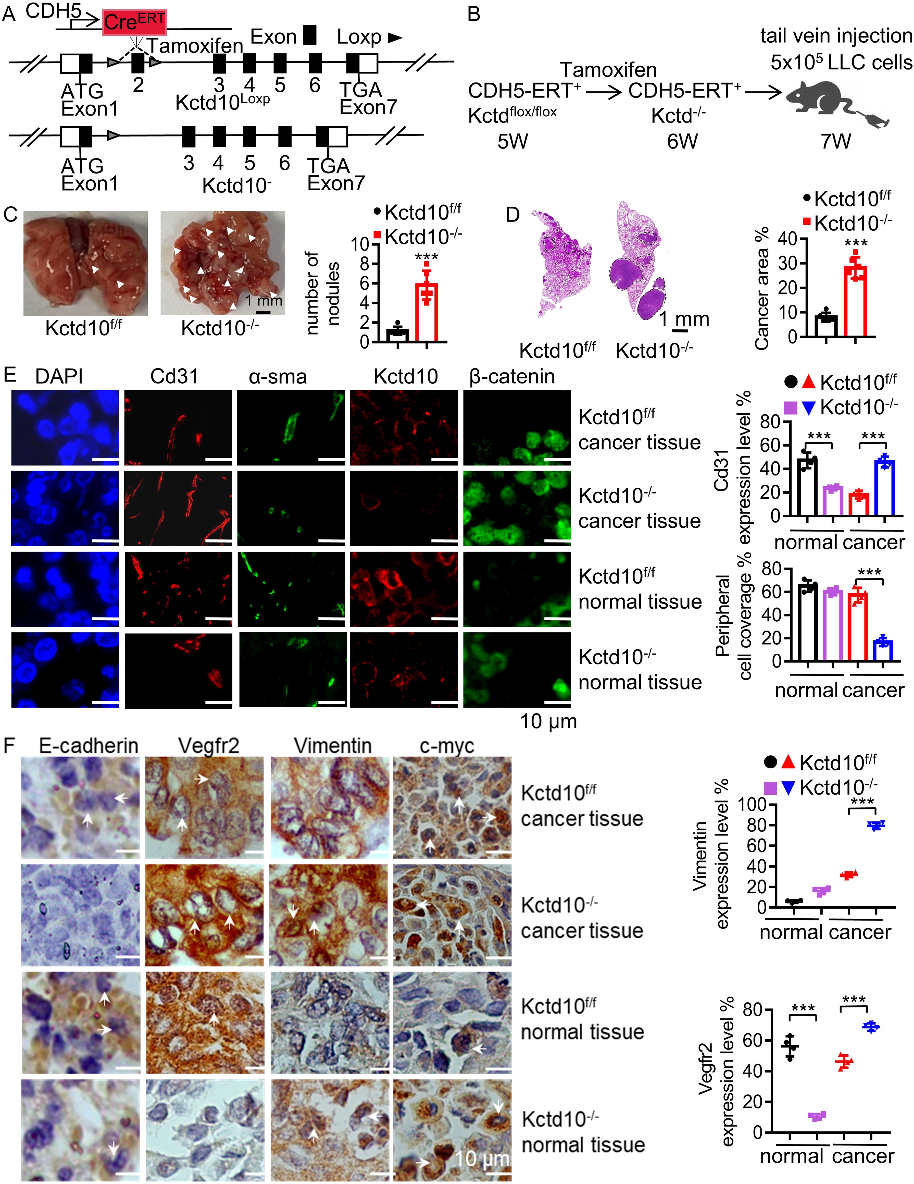 Figure 7. Endothelial Kctd10 knockout inhibits angiogenesis and metastatic phenotypes in lung tumors. (A) Construction strategy for Kctd10flox/floxCDH5CreERT2/+ mice. (B) Experimental strategy for inducible Kctd10 knockout and LLC cell injection in Kctd10flox/floxCDH5CreERT2/+ mice. Mice were treated by tamoxifen (75 mg/kg) for one week (n=5/group). (C, D) Images of lung cancer and corresponding HE staining in conditional knockout mice. (E, F) Immunofluorescence and IHC analysis of target gene expression in mouse lungs and lung tumor tissues. ***P < 0.001.