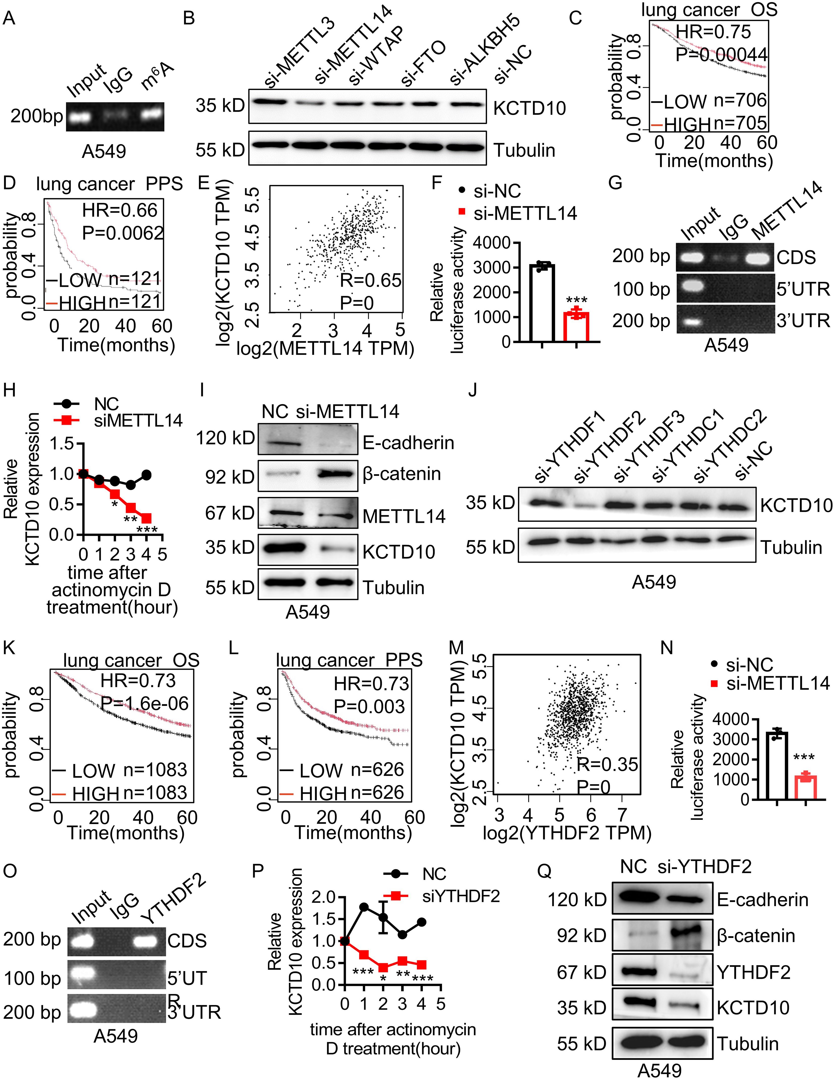Figure 8. METTL14 and YTHDF2 mediates m6A modification of KCTD10 and enhances its mRNA stability. (A) MeRIP detecting m6A modification of KCTD10 CDS. (B) KCTD10 protein levels following m6A-related interfering RNAs. (C, D) Correlation between METTL14 expression and overall/post-progression survival in lung cancer patients using Kaplan-Meier Plotter survival analysis. (E) Correlation between METTL14 and KCTD10 expression in lung cancer using the GEPIA database. (F) Effects of METTL14 on the luciferase reporter activity of KCTD10. (G) RIP analysis detecting METTL14 binding to the predicted modification site of KCTD10. (H) qPCR analysis of KCTD10 RNA stability following METTL14 knockdown. (I) Western blot analysis of KCTD10 and related protein expression in A549 cells following METTL14 interference. (J) KCTD10 protein expression after m6A-related RNA interference. (K, L) Correlation between YTHDF2 expression and patient survival. (M) The GEPIA database analyzing the correlation between YTHDF2 and KCTD10 expression. (N) Effect of YTHDF2 knockdown on luciferase reporter activity of KCTD10. (O) RIP analysis of YTHDF2 binding to predicted modification sites of KCTD10 in A549 cells. (P) qPCR analysis of KCTD10 RNA stability following YTHDF2 knockdown. (Q) Western blot analysis of KCTD10 and downstream gene expression following YTHDF2 knockdown. *P < 0.05, **P < 0.01, ***P < 0.001.