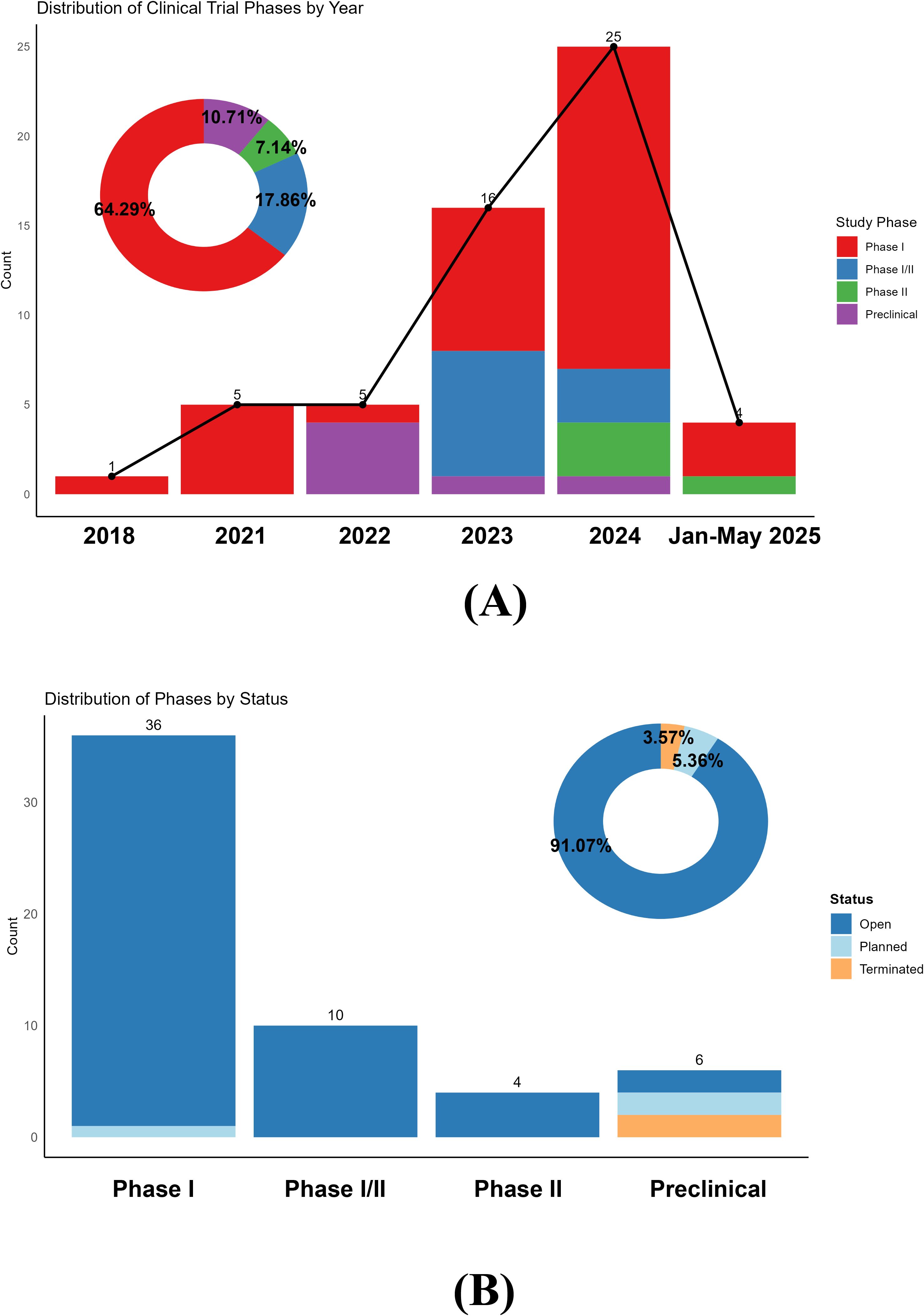 Figure 1. (A) Distribution of clinical trial phases by year. The bar chart illustrates the number of clinical trials initiated each year, categorized by phase. Note that the data for the year 2025 are incomplete and include trials registered only from January to May; it does not represent a full year’s data or a projection. The donut chart summarizes the phase distribution across all years. (B) Clinical phases of chimeric antigen receptor T-cell immunotherapy for autoimmune rheumatic disease clinical trials.