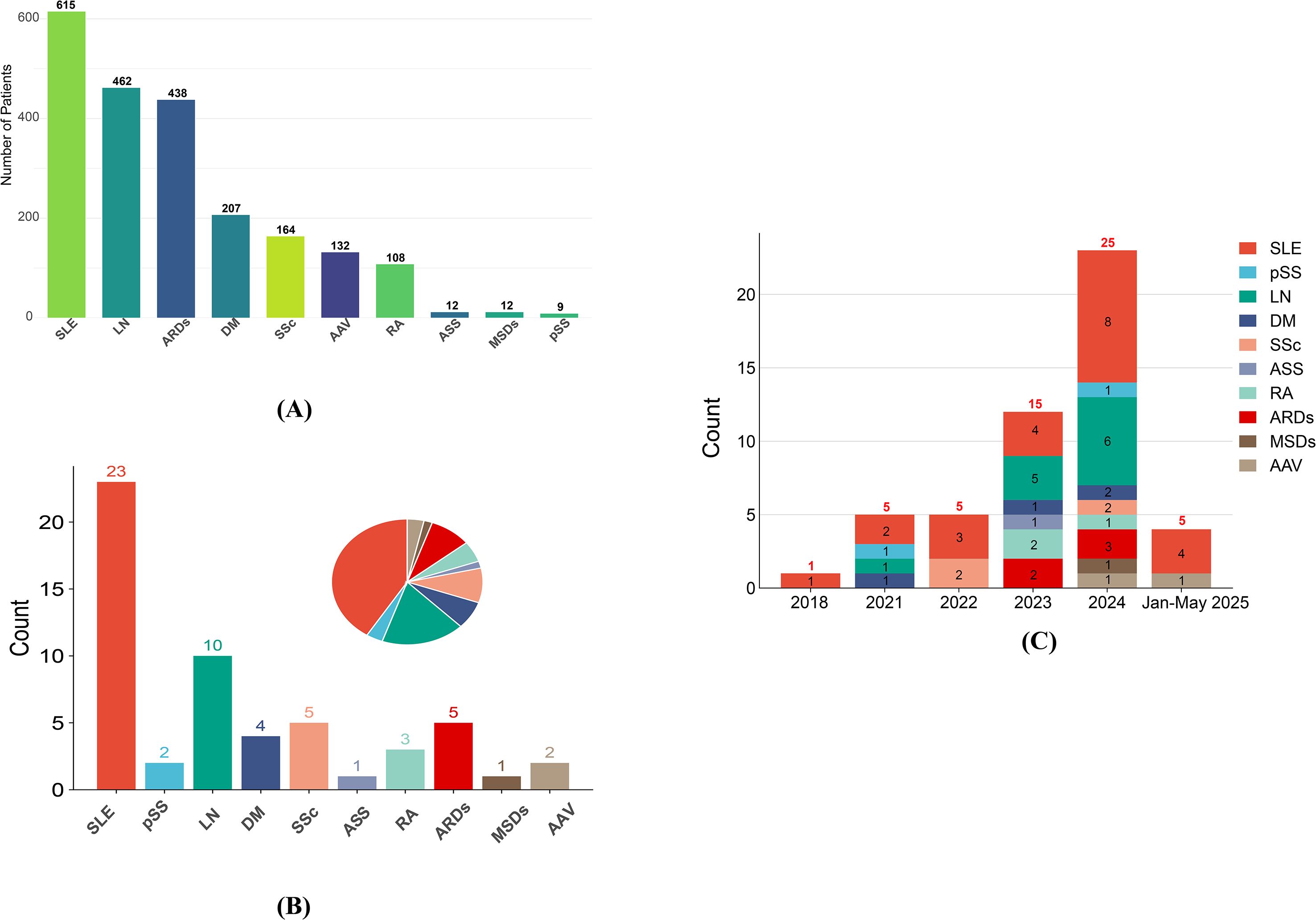 Figure 2. (A) Enrollment for different ARDs; (B) ARDs distribution in clinical trials; (C) timeline of clinical trials for various autoimmune rheumatic diseases. SLE, Systemic lupus erythematosus; pSS, primary Sjögren syndrome; LN, Lupus nephritis; DM, Dermatomyositis; SSc, Systemic sclerosis; ASS, Anti-synthetase syndrome; RA, Rheumatoid arthritis; ARDs, Autoimmune rheumatic diseases; MSDs, Musculoskeletal disorders; AAV, ANCA-associated vasculitis.