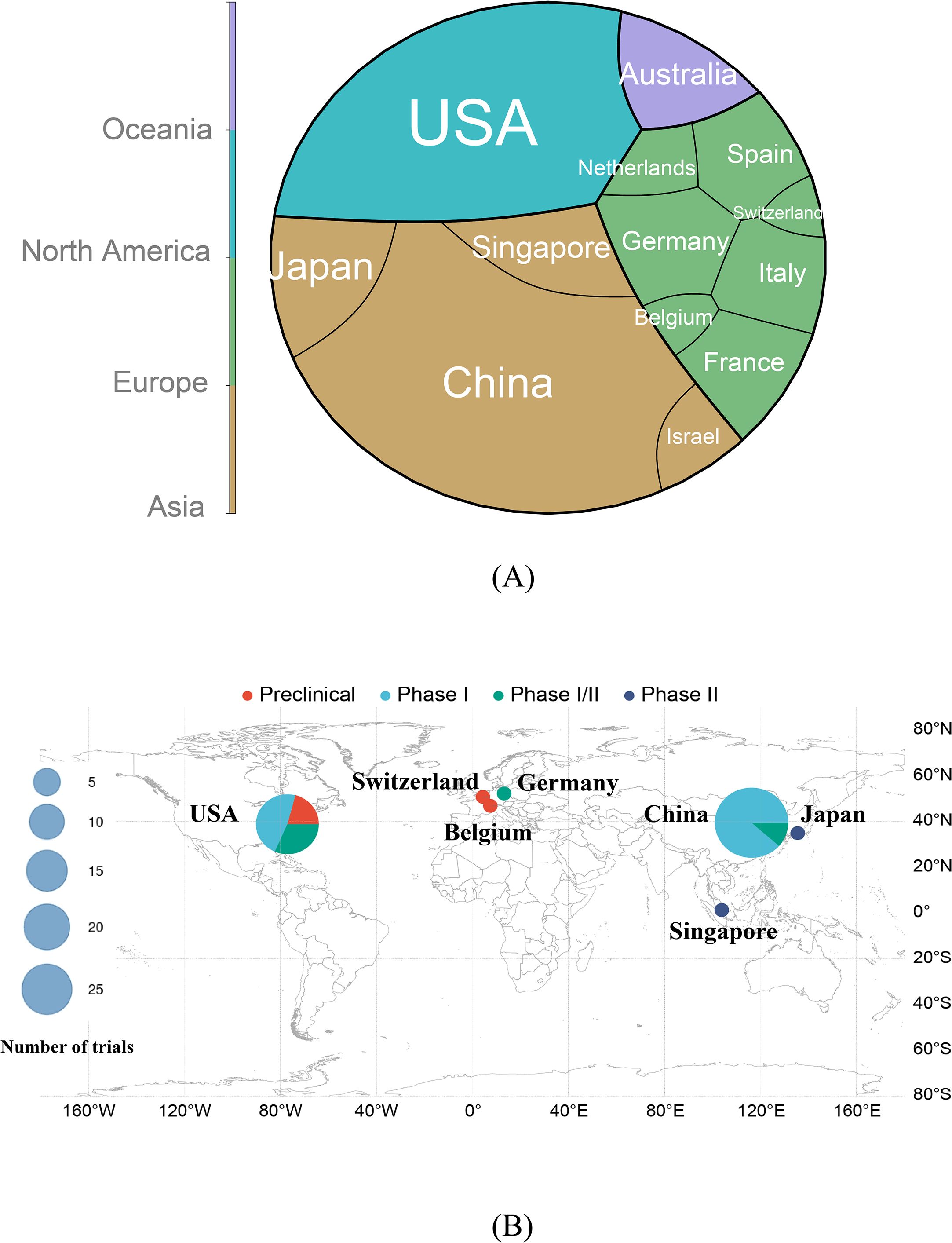 Figure 3. (A) Distribution of countries and their respective continents in chimeric antigen receptor T-cell immunotherapy clinical trials for ARDs. (B) Geographic distribution of countries engaged in chimeric antigen receptor T-cell immunotherapy research for autoimmune rheumatic diseases. The size of each circle corresponds to the total number of trials conducted in that country, with the scale shown in the legend. The clinical trial phases are color-coded as follows: red (Preclinical), sky blue (Phase I), green (Phase I/II), and dark blue (Phase II). Key countries, including the United States (USA), Switzerland, Germany, Belgium, China, Japan, and Singapore, are annotated to illustrate their respective research focus and trial phase distribution. This visualization highlights both the global engagement and phase-specific research efforts across different geographical regions. ARDs: Autoimmune Rheumatic Diseases.