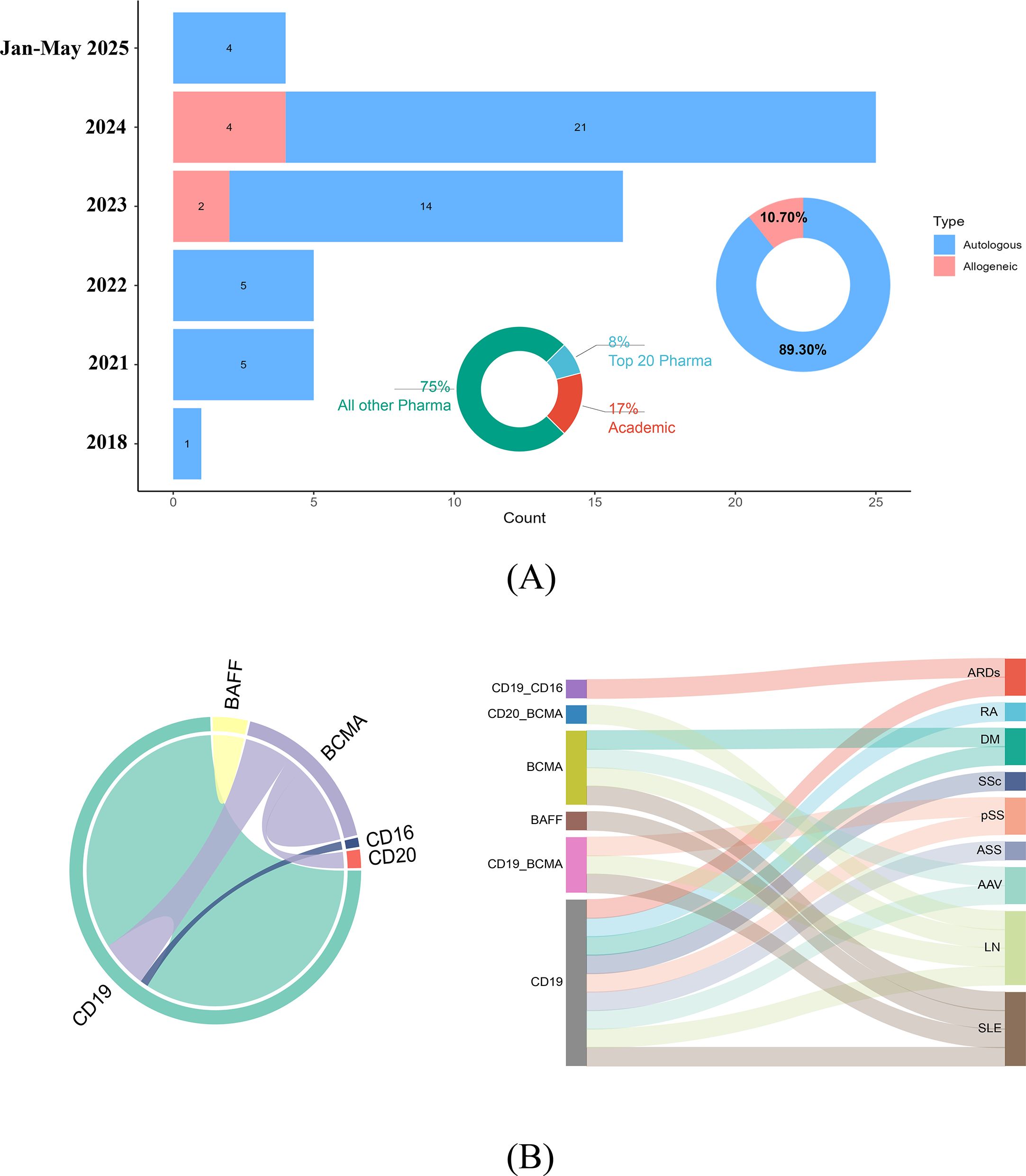 Figure 4. (A) A smaller pie chart depicts the sectoral distribution of chimeric antigen receptor T-cell studies between the pharmaceutical industry and academic institutions, highlighting their respective contributions. The larger pie chart illustrates the proportional allocation of allogeneic versus autologous chimeric antigen–receptor T-cell therapeutic approaches. The bar graph shows a marked surge in autologous chimeric antigen receptor T-cell therapeutic research from 2021-2024, with a peak of 25 clinical studies recorded in 2024. Data for the period from January to May 2025, representing ongoing or initial year-to-date figures, are also included and include 4 autologous studies. Concurrently, allogeneic CAR-T-cell studies have maintained a consistent proportion, reflecting sustained interest in this modality. (B) The chord diagram (left section) provides a circular layout that visually connects genetic markers and cell targets on the basis of their co-occurrence in research studies. The thickness and color intensity of the chords reflect the frequency and strength of these associations. The Sankey diagram (right section) illustrates the flow and specificity of genetic markers (e.g., BAFF, BCMA, CD19, and CD20) and cell targets across various autoimmune rheumatic diseases. The varying widths of the bands indicate the relative emphasis on specific markers and targets within each disease category. SLE, Systemic lupus erythematosus; pSS, primary Sjögren syndrome; LN, Lupus nephritis; DM, Dermatomyositis; SSc, Systemic sclerosis; ASS, Anti-synthetase syndrome; RA, Rheumatoid arthritis; ARDs, Autoimmune rheumatic diseases; AAV, ANCA-associated vasculitis.