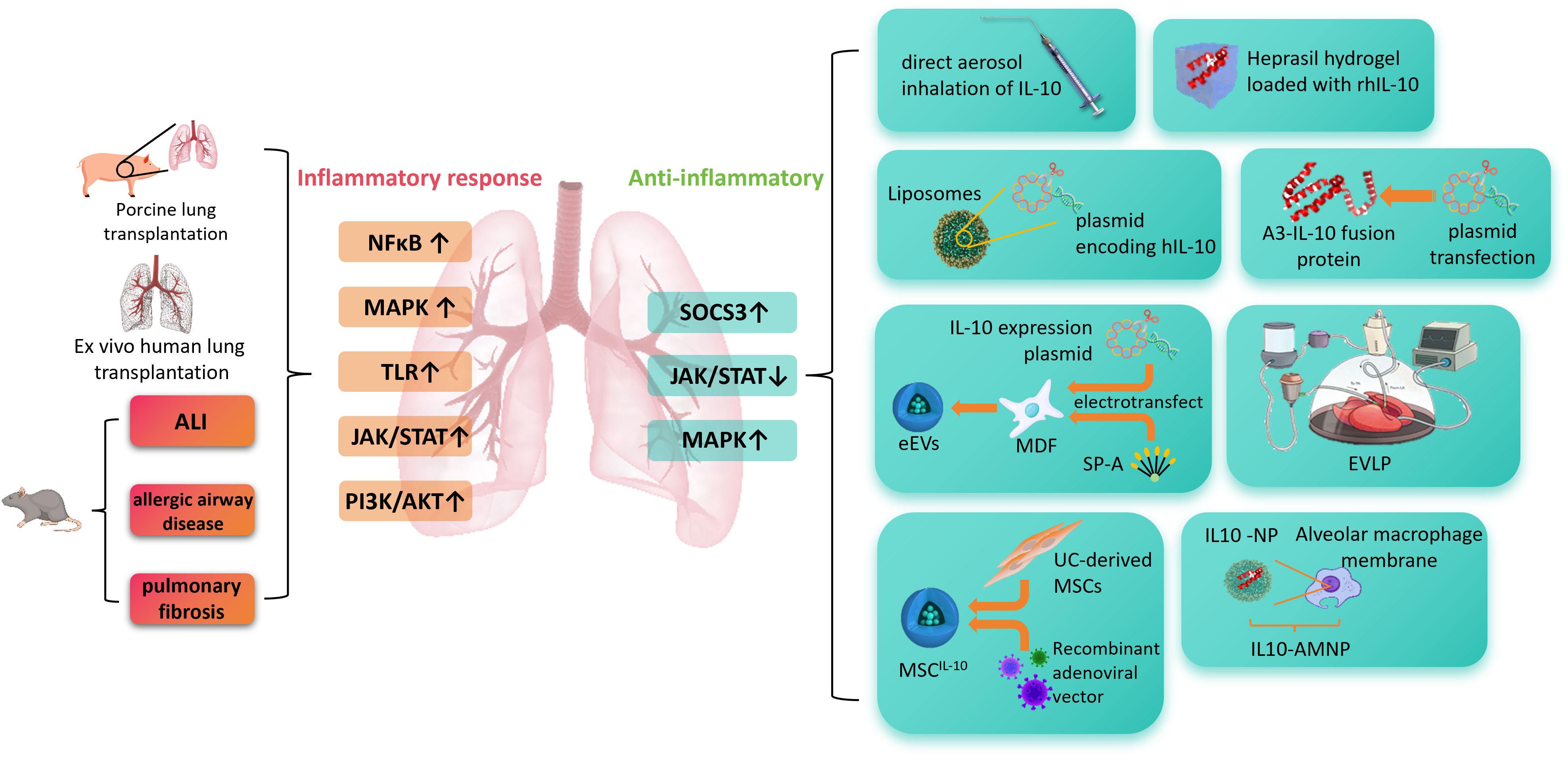 Extracellular vesicles (EVs) are naturally derived carriers that play a key role in mediating intercellular communication, sharing molecular cues with their donor cells (103, 104). EVs can directly cross biological barriers to deliver various active biomolecules, with no significant size limitations (105). This allows EVs to overcome challenges faced by other delivery systems, such as nanoparticles. Mesenchymal stem cell (MSC)-derived EVs are the most common type, and even without carrying anti-inflammatory cytokines or therapeutic drugs, EVs and their derived nanovesicles (NVs) can suppress systemic inflammation (106, 107). MSC-EVs have demonstrated good efficacy in ALI (108, 109), lung transplantation (110), and asthma (111), with the anti-inflammatory effects being mediated by IL-10. When EVs are used as carriers for IL-10, they fully retain its immunomodulatory function (112), allowing IL-10 to penetrate biological barriers that it would not normally cross (113). Chitosan/alginate-modified EVs can protect IL-10 from premature degradation by the body’s environment (114). These findings make EVs direct as carriers for IL-10 in the treatment of pulmonary inflammation highly promising. In studies using a porcine lung transplantation model (115) and an ex vivo human lung model (116), Antti I. Nykänen and his team developed engineered mesenchymal stem cells capable of expressing IL-10, designated as MSCIL-10. This engineered MSC technology involves adenoviral transduction of human umbilical cord-derived mesenchymal stem cells (hUC-MSCs) to produce higher levels of human IL-10 (hIL-10). These cells maintained high levels of IL-10 secretion for at least six days even after cryopreservation and thawing, and are able to stably express IL-10 in ex vivo human lungs. When MSCIL-10 was used during EVLP, IL-10 levels in the perfusate increased significantly without negatively affecting lung function. In EVLP, a single administration of 20×106 MSCIL-10 markedly reduced pulmonary apoptosis, whereas increasing the dose to 40 × 106 promoted apoptosis. However, the therapeutic effect remained limited. This was mainly due to the difficulty in reversing elevated pro-inflammatory cytokine levels in poor-quality donor lungs, the detrimental impact of impaired donor lung metabolism on MSCIL-10 function, the challenge of maintaining IL-10 levels in a low-pH environment (pH < 6.4), and the inability of MSCIL-10 to survive for more than 3 days after administration via EVLP and subsequent lung transplantation. Overall, these studies open new avenues for IL-10-based cell delivery and the treatment of post–lung transplantation complications.