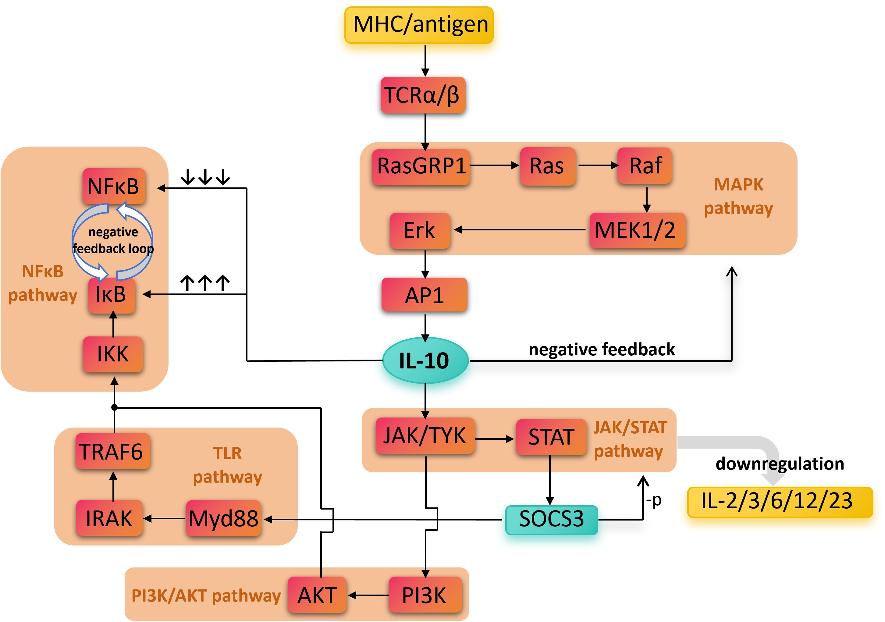 Figure 2. The direct and indirect biochemical pathways involved in IL-10’ s anti-inflammatory effects. Antigen recognition activates multiple pro-inflammatory pathways, including TCR, NF-κB, TLR, and PI3K/AKT, leading to inflammatory responses. In contrast, IL-10 signals through the JAK/STAT pathway to induce SOCS3 expression, which suppresses the production of pro-inflammatory cytokines such as IL-2, IL-3, IL-6, IL-12, and IL-23. Overall, the figure emphasizes IL-10 as a key anti-inflammatory mediator that negatively regulates inflammatory signaling, maintains immune homeostasis, and prevents excessive immune damage. Nuclear Factor kappa-light-chain-enhancer of activated B cells, NF-κB; Mitogen-Activated Protein Kinase, MAPK; Toll-Like Receptor, TLR; Phosphoinositide 3-Kinase/Protein Kinase B, PI3K/AKT; Janus Kinase/Signal Transducer and Activator of Transcription, JAK/STAT; Major Histocompatibility Complex, MHC; T Cell Receptor alpha/beta, TCRα/β; Ras Guanyl Releasing Protein 1, RasGRP1; Rat sarcoma viral oncogene homolog, Ras; Rapidly Accelerated Fibrosarcoma kinase, Raf; Mitogen-Activated Protein Kinase Kinase 1/2, MEK1/2; Extracellular Signal-Regulated Kinase, Erk; Activator Protein 1, AP-1; IκB Kinase, IKK; Inhibitor of κB, IκB; TNF Receptor-Associated Factor 6, TRAF6; Interleukin-1 Receptor-Associated Kinase, IRAK; Myeloid Differentiation Primary Response 88, Myd88; Phosphoinositide 3-Kinase, PI3K; Protein Kinase B (also called PKB), AKT; Janus Kinase/Tyrosine Kinase, JAK/TYK; Signal Transducer and Activator of Transcription, STAT; Suppressor of Cytokine Signaling 3, SOCS3; Interleukin, IL.