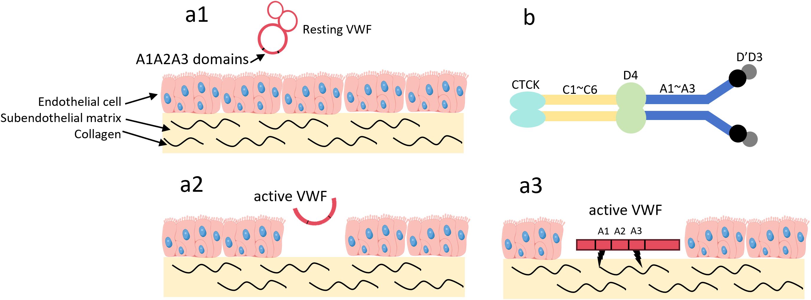 Figure 3. The VWF A3 domain can target type I and type III collagen. (a1) In the absence of vascular wall injury, VWF circulates in the blood in its resting state. In this state, VWF adopts a globular conformation, and the A1 and A3 domains are not exposed; (a2) Upon vascular wall injury, high shear stress activates VWF, and collagen in the subendothelial matrix becomes exposed; (a3) The A1 and A3 domains of VWF bind to the exposed collagen; (b) VWF exists as a dimer. Among these domains, the A1 domain can target type I, IV, VI collagen, while the A3 domain can target type I, III collagen. Von Willebrand Factor, VWF; C-terminal Cysteine Knot domain, CTCK.