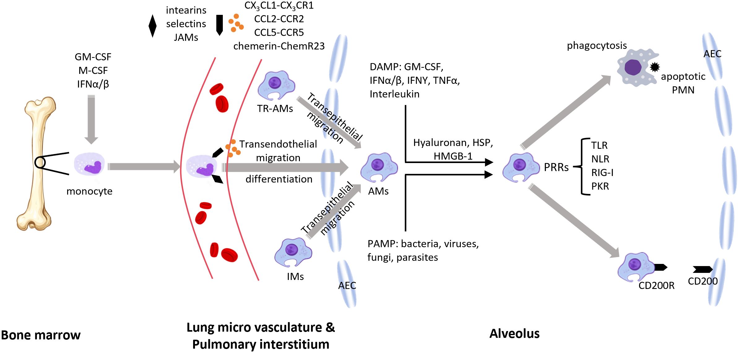 Figure 4. During pulmonary inflammation, lung macrophages from different origins can be recruited to the site of inflammation (1). Growth factors such as GM-CSF, M-CSF, and IFNs drive the differentiation and activation of macrophage progenitors (e.g., monocytes), which then enter the bloodstream (2). Macrophages are recruited to the alveoli under the influence of chemokines and their receptors, the ChemR23–chemerin axis, and adhesion molecules (3). Resident alveolar macrophages and interstitial macrophages are also recruited to the alveolar space (4). Pathogen-associated molecular patterns (PAMPs) and damage-associated molecular patterns (DAMP) transmit signals through (PRRs) (5). Macrophages phagocytose apoptotic neutrophils and promote an anti-inflammatory macrophage phenotype via the CD200–CD200R interaction. GM-CSF, granulocyte-macrophage colony-stimulating factor; M-CSF, macrophage colony-stimulating factor; IFN, interferon; JAMs, junctional adhesion molecules; TR-AMs, tissue-resident alveolar macrophages; AMs, alveolar macrophages; IMs, interstitial macrophages; DAMP, damage-associated molecular patterns; PAMP, pathogen-associated molecular patterns; HSP, heat shock proteins; HMGB-1, high-mobility group box 1; PRRs, pattern recognition receptors; TLR, toll-like receptor; NLR, NOD-like receptor; RIG-I, retinoic acid-inducible gene I; PKR, protein kinase R; PMN, polymorphonuclear neutrophils; AEC, alveolar epithelial cell.