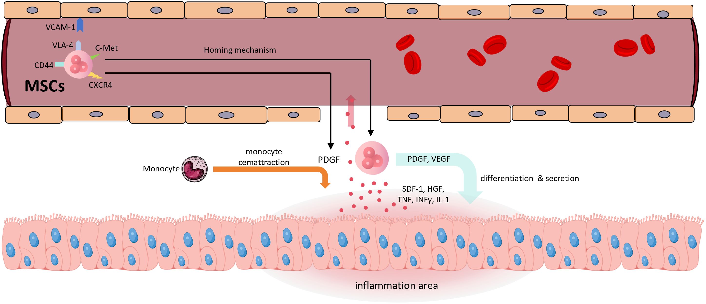 Figure 5. The homing mechanism of MSCs (1) Inflammatory regions release pro-inflammatory cytokines such as TNF, IFN-γ, and IL-1, as well as chemokines like SDF-1 and HGF, which enter the bloodstream (2). CXCR4 recognizes SDF-1, and c-Met recognizes HGF, initiating the homing mechanism (3). VCAM-1, VLA-4, and CD44 are involved in cell rolling, adhesion, and transendothelial migration (4). MSCs secrete PDGF and VEGF; the former promotes monocyte recruitment, while both contribute to the transition of inflamed tissue toward regeneration (5). MSCs themselves participate in tissue differentiation. SDF-1, stromal cell-derived factor 1; HGF, hepatocyte growth factor; CXCR4, C-X-C chemokine receptor type 4; c-Met, mesenchymal-epithelial transition factor; VLA-4, very late antigen-4.