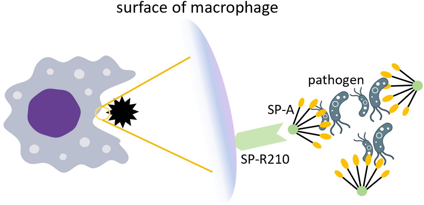 Figure 6. The role of SP-A in pathogen clearance. SP-A recognizes and aggregates pathogens by relying on the COOH-terminal carbohydrate recognition domain. The SP-R210 receptor on the surface of macrophages recognizes SP-A and enhances phagocytosis of pathogens.