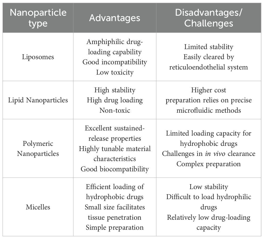 Polymeric nanoparticles (PNPs), liposomes and lipid-based nanoparticles are widely used as typical nanocarrier systems (76). Liposomes are spherical vesicles composed of at least one layer of lipid bilayers. They vary in size from nanometers to micrometers and are primarily composed of phosphatidylcholine or lipids (77). Liposomes offer excellent biocompatibility, can encapsulate both hydrophilic and lipophilic agents, and exhibit minimal toxicity (78). In the treatment of pulmonary diseases, they can extend the local effect and reduce irritation to lung tissue (79). Inhalation administration is a more effective method for delivering liposomes to the lungs; however, intraperitoneal injection of liposomes carrying IL-10 gene expression plasmids can still alleviate lung injury in a mesenteric ischemia-induced ALI mouse model. In the study by Burhan Kabay et al. (80), mice injected with liposome-encapsulated hIL-10 plasmid DNA exhibited an increase in plasma hIL-10 concentration to 12.8 ± 1.28 ng/ml at the time of sacrifice. The lung wet-to-dry weight ratio in animals receiving the empty vector was significantly elevated to 7.47 ± 0.35, whereas the ratio in the treatment group was 4.26 ± 0.47. This indicates that the therapeutic intervention markedly improved pulmonary edema in ALI mouse. The activity of myeloperoxidase (MPO) was determined using a spectrophotometric method, and the treatment group exhibited approximately a twofold reduction in MPO activity compared with the empty vector group. The 2-hour survival rate in the treatment group was increased by 30% compared with the empty vector group. Lipid nanoparticles (LNs) are lipid-based nanocarriers. LNs are colloidal carriers made of biodegradable lipid matrices that are considered Generally Recognized as Safe (GRAS) and are stabilized by surfactants (81). LNs offer advantages such as high stability, large drug loading capacity, and non-toxicity (82), and although some LN-based platforms have been developed to enable targeted delivery to the lung (83–86), no studies have yet explored their use in IL-10 delivery or pulmonary disease treatment. Poly (D,L-lactic-co-glycolic acid, PLGA) copolymers emphasize biocompatibility and biodegradability (87), which can extend the in situ retention time of drugs and enhance mucosal penetration (88). IL-10 encapsulated in PLGA-chitosan can inhibit IL-6 and TNF-mediated inflammatory responses (89). Inhalation of PLGA-encapsulated MSC-derived exosomes has been shown to inhibit airway inflammatory responses (90). Poly-lactic acid-polyethylene glycol (PLA-PEG) is an amphiphilic polymer, and the use of PLA-PEG to encapsulate IL-10 in polymer nanoparticles significantly extends the half-life of IL-10 and improves its thermal stability (91). Micelles are relatively less common in IL-10 delivery; they are colloidal particles composed of amphiphilic block copolymers or surfactants (92), typically ranging in size from 5 nm to 100 nm. Micelles can prevent alveolar macrophage uptake and prolong drug release (93). In a mouse model of pulmonary fibrosis, intravenous injection of collagen-conjugated micelles carrying VWF-A3 fused IL-10 (A3-IL-10) significantly improved the degree of pulmonary fibrosis. Table 1. compares the advantages and disadvantages of the nanoparticles discussed in this section.