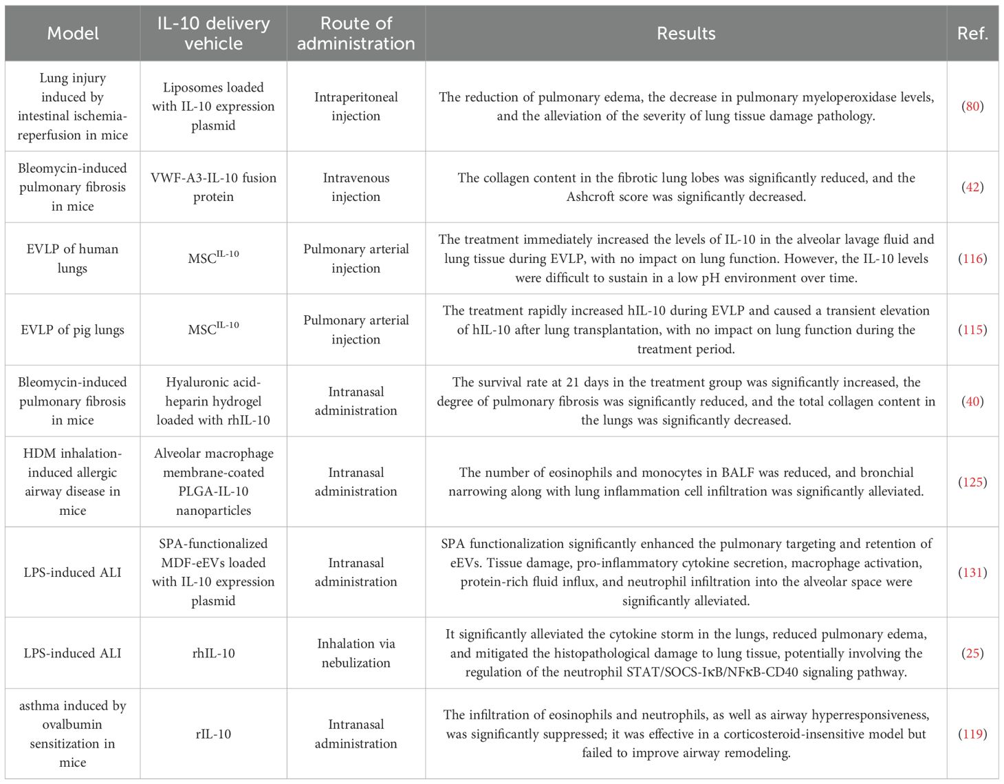 Table 2. Overview of IL-10-Based Therapeutic Strategies and Delivery Systems for Pulmonary Diseases”.