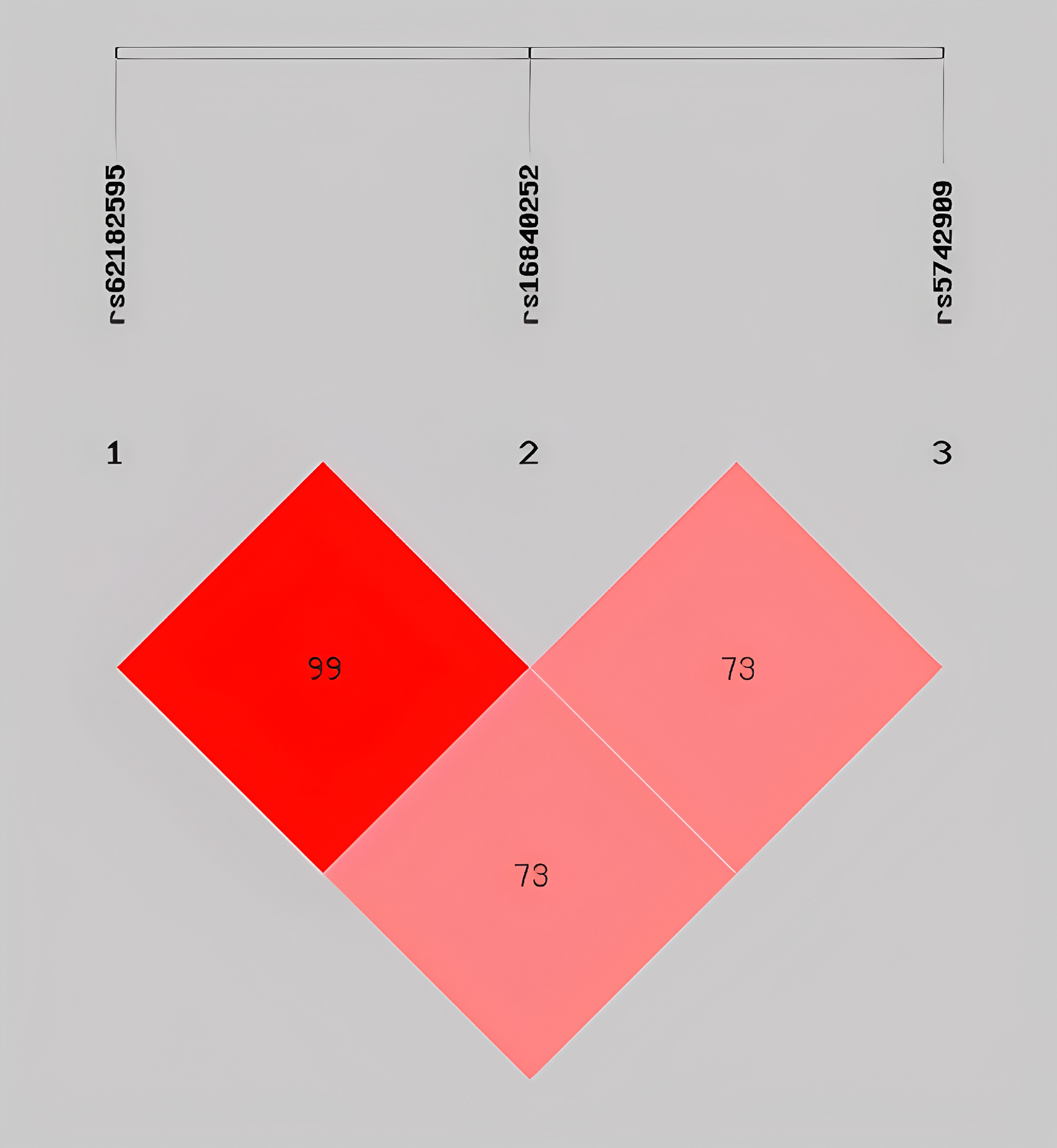 To evaluate the interactions among CTLA4 SNPs, we performed LD and haplotype analyses using the SHEsis online platform. Strong LD was observed between rs62182595 and rs16840252 (D’ = 1), whereas moderate LD was observed between rs62182595 and rs5742909 (D’ = 0.739) and between rs16840252 and rs5742909 (D’ = 0.735) (Figure 1).