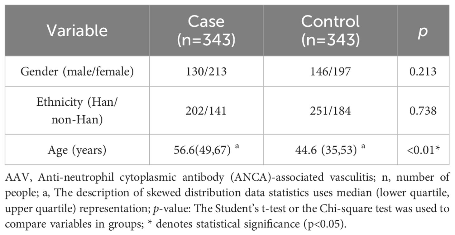 The study cohort comprised equal numbers of patients with AAV (n = 343) and healthy controls (n = 343). Gender distribution showed comparable patterns across groups, with the AAV cohort comprising 130 male and 213 female participants, compared to 146 males and 197 females in the control group (P = 0.213). Age distribution revealed significant intergroup variation. The AAV group showed a mean age of 56.7 years (range, 8–86 years; interquartile range (IQR), 49–67 years), which was significantly higher than that of the control group (mean, 44.6 years, range: 18–81 years; IQR, 35–53 years) (P < 0.05). Ethnic composition was comparable between the groups, with 202 Han Chinese and 141 non-Han Chinese participants in both cohorts (P = 0.738). To ensure analytical rigor, potential confounding variables, including age, sex, and ethnicity, were incorporated as covariates in the logistic regression analysis (Table 1).