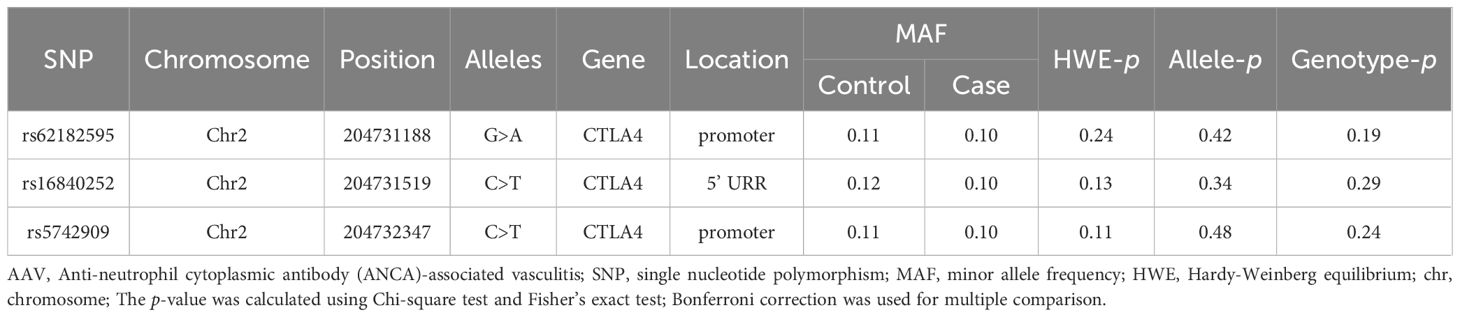 Cytotoxic T lymphocyte-associated protein 4 (CTLA-4), a crucial immune checkpoint molecule within the CD28 immunoglobulin superfamily, exhibits predominant expression in T lymphocytes (12). CTLA-4 is an important regulator of T-cell homeostasis and self-tolerance and can modulate the T-cell response by blocking CD28 co-stimulation of T-cells during T-cell activation (13, 14). CTLA-4 expression in T cells is tightly regulated, and the failure of the transport mechanism of CTLA-4 to the cell surface leads to autoimmune susceptibility (14). Given its central role in immune modulation, CTLA-4 has emerged as a promising therapeutic target across multiple disease domains, particularly in autoimmune conditions and oncology. Moreover, CTLA-4-targeted therapies through the successful implementation of CTLA-4 inhibitors have been validated to manage various immune-mediated disorders clinically (12). In AAV, CTLA-4–Ig fusion proteins that block T-cell co-stimulation offer a novel therapeutic strategy potentially advantageous over traditional immunosuppressive regimens (15). However, genetic studies have reported inconsistent associations between CTLA4 polymorphisms and AAV. For instance, a European case–control study identified the association between CTLA4 polymorphism— rs3087243 —and AAV (16). In contrast, a case—control study of the Han Chinese population in Beijing, China, reported no association between CTLA4 polymorphisms (rs231775 and rs5742909) and AAV susceptibility (17). These findings suggest the strong influence of ethnicity, population, and regional variation on genetic susceptibility; however, the association between single-nucleotide polymorphisms (SNPs) at the CTLA4 locus and AAV susceptibility in the Guangxi population has not been reported.