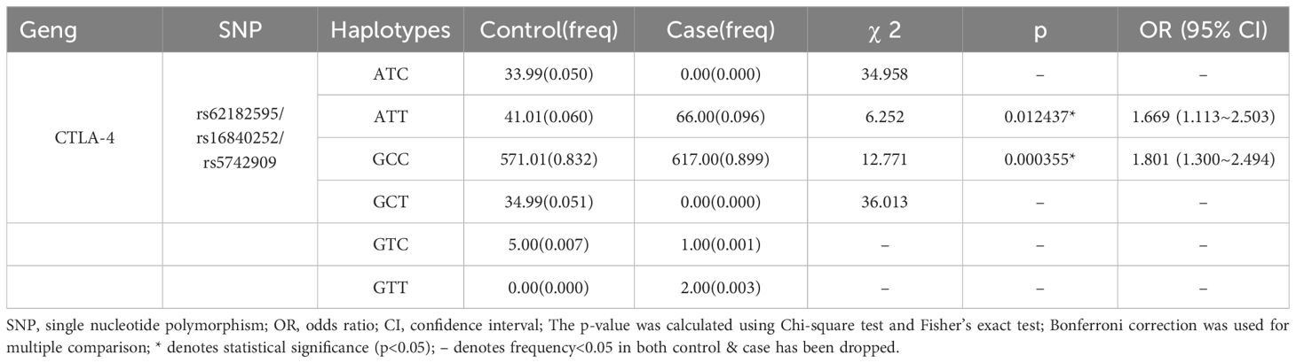 Discussion: These findings suggest that CTLA4 polymorphisms (rs62182595, rs16840252, and rs5742909) may contribute to AAV susceptibility in the Guangxi population and offer preliminary markers for risk assessment, early diagnosis, and personalized management of AAV.