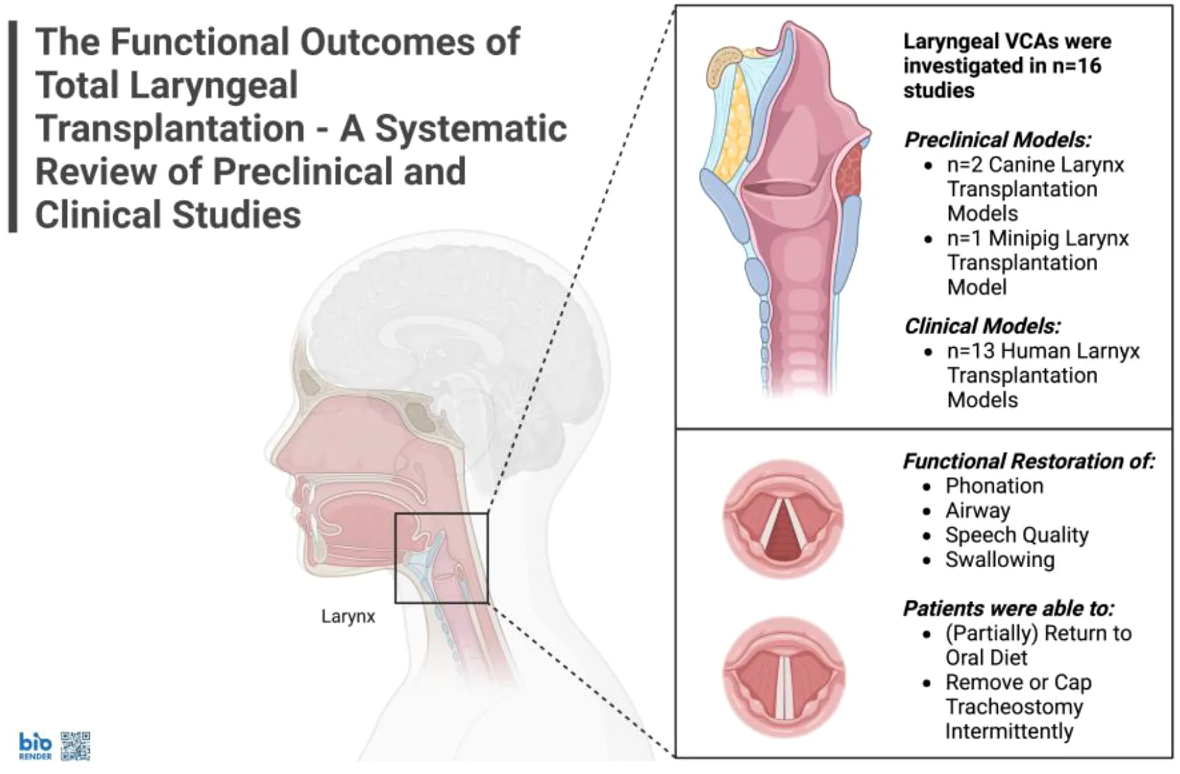 Results: Out of n=188 identified studies, n=16 (8.5%) met the inclusion criteria. There were n=13 (81%) clinical and n=3 (19%) preclinical studies. In preclinical models, canine and minipig studies showed partial recovery: electrical stimulation restored vocal fold mobility in n=8 (40%) of canine allografts; some minipigs recovered swallowing, vocalization, and short-term survival post-transplant without immunosuppression, though all canines remained tracheostomy-dependent. Among n=18 (100%) human recipients, speech or phonation was restored fully or partially in n=12 (67%), as well as full or partial oral intake. Here, n=3 patients (17%) died within two years post-VCA, while n=4 (36%) resumed full oral intake. Voice quality was considered as satisfactory or better than pre-VCA in n=6 (55%) patients, whereas airway patency was deemed good or excellent. Nonetheless, no patient regained full vocal fold mobility. However, n=1 (5.6%) patient was able to breathe without a tracheostomy, and n=1 (5.6%) could intermittently cap their tracheostomy tube. Immunosuppressive regimens included tacrolimus (n=18, 100%), mycophenolate mofetil (n=15, 83%), corticosteroids (n=15, 83%), and anti-thymocyte globulin (n=6, 33%), with adjunctive use of leflunomide and stem cells in select cases.