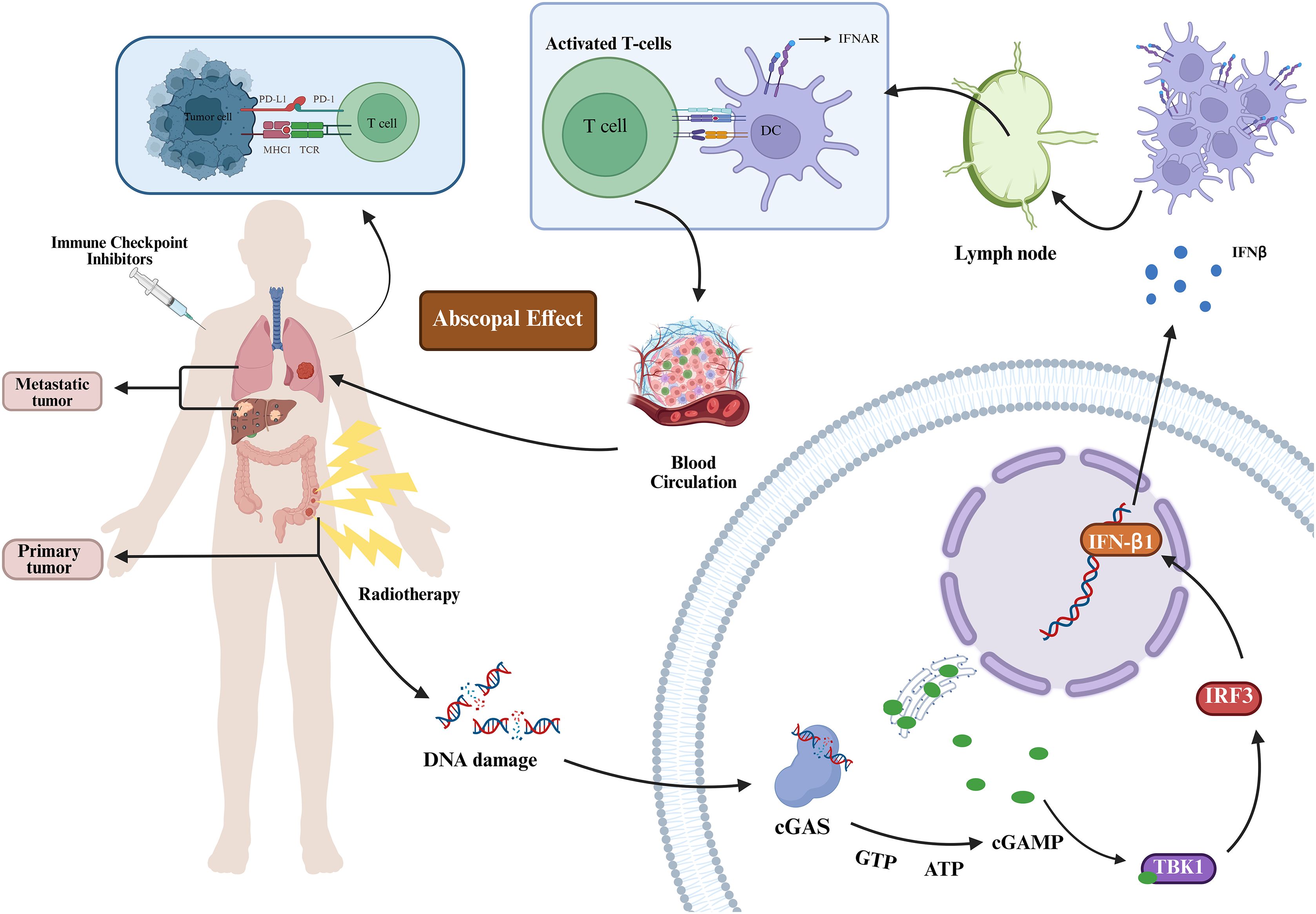 Figure 1. Immune priming and the abscopal effect induced by radiotherapy. Radiotherapy induces DNA double-strand breaks in tumor cells, leading to the release of DNA fragments into the cytoplasm, where they are detected by cyclic GMP–AMP synthase (cGAS). Upon binding cytosolic DNA, cGAS is activated to catalyze the synthesis of cyclic GMP–AMP (cGAMP), which acts as a second messenger to activate stimulator of interferon genes (STING) located on the endoplasmic reticulum membrane. Activated STING recruits and phosphorylates TANK-binding kinase 1 (TBK1), subsequently activating interferon regulatory factor 3 (IRF3). Phosphorylated IRF3 translocates to the nucleus and initiates the transcription of type I interferons (e.g., IFN-b) and inflammatory cytokines, enhancing dendritic cell (DC) function and promoting CD8+ T cell activation as well as MHC-I upregulation. These activated tumor-specific T cells proliferate and migrate to distant, non-irradiated tumor sites, mediating cytotoxicity and inducing the abscopal effect. Immune checkpoint inhibitors block inhibitory signaling pathways such as PD-1/PD-L1, relieving T cell exhaustion and amplifying both local and systemic antitumor immune responses.