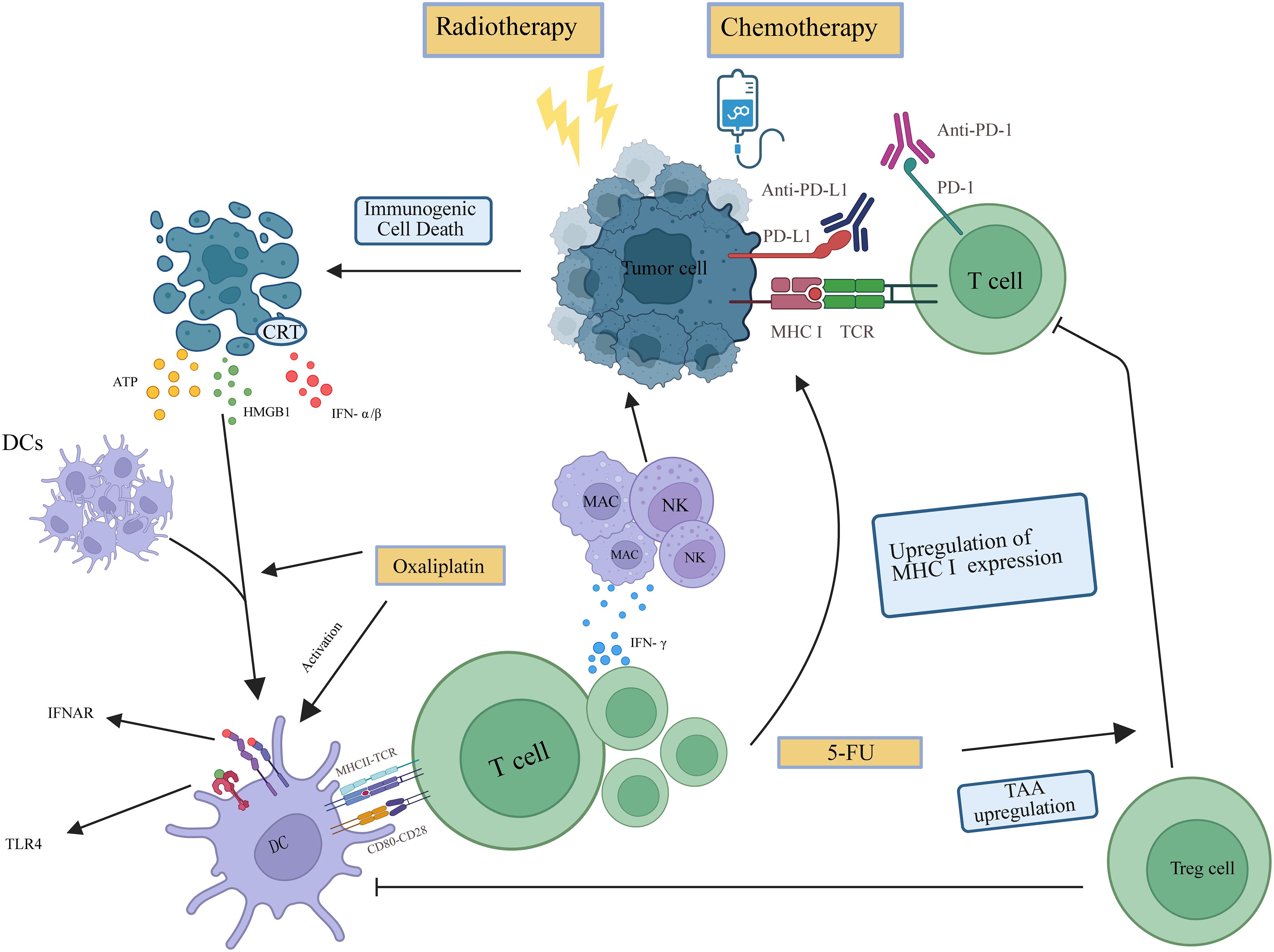 Figure 2. The underlying mechanisms for combining nCRT with immunotherapy. Radiotherapy or certain chemotherapeutic agents can induce immunogenic cell death (ICD) in tumor cells, characterized by three key damage-associated molecular pattern (DAMP) signals (1): surface exposure of calreticulin (CRT) triggered by endoplasmic reticulum stress, which facilitates dendritic cell (DC) recognition and phagocytosis (2); active release of ATP, which serves as a chemoattractant to recruit immune cells and activate DCs; and (3) release of high-mobility group box 1 (HMGB1) upon cell death, which binds to TLR4 on DCs to further enhance antigen presentation. DCs present tumor antigens to T cells via MHC molecules and secrete IFN-g, which in turn activates macrophages and natural killer (NK) cells, enhances antigen presentation, and upregulates MHC-I expression to promote cytotoxic T lymphocyte (CTL) function. 5-fluorouracil increases tumor-associated antigens (TAAs) and reduces Treg-mediated suppression of DCs and T cells. Oxaliplatin specifically induces ICD. PD-L1 blockade relieves T-cell functional exhaustion by inhibiting the interaction with its receptor on T cells.