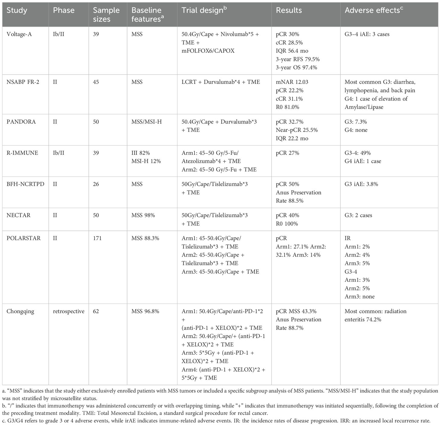 The NSABP FR-2 study incorporated 45 individuals diagnosed with pMMR/MSS stage II–IV RC. The treatment protocol involved CRT, which was succeeded by four cycles of durvalumab immunotherapy, with the median modified neoadjuvant rectal (mNAR) Score designated as the primary endpoint. Among the 40 evaluable patients, the mean mNAR was reported as 12.03 (80% CI: 9.29–14.97, p = 0.06). A pCR rate of 22.2% was observed, with only one instance of a grade IV adverse reaction (elevated amylase/lipase) documented (34). The Italian PANDORA study (35) included 55 individuals with LARC who received three cycles of durvalumab monotherapy following nCRT. Results demonstrated that 34.5% of patients (19/55) achieved pCR(95% CI, 22.2%-48.6%). Furthermore, the incidence of grade III–IV toxicity related to either nCRT or durvalumab remained low. However, The absence of stratification by microsatellite status (MSS vs. MSI-H) in the PANDORA study may have contributed to a potentially inflated pCR rate. The study reported a median follow-up duration of 22.2 months (95% CI, 20.2–26.1 months), and the median disease-free survival (DFS) was not reached. In comparison to the conventional pCR rate of approximately 15%–20% typically achieved with standard nCRT, all three aforementioned studies reported pCR rates exceeding 30%, with overall complete response (CR) rates also surpassing this range, suggesting a substantial enhancement in tumor response through the integration of nCRT and immunotherapy. Different trials showed varying pCR rates. The PANDORA study demonstrated a higher pCR rate compared to the NSABP FR-2 trial, which may be related to a longer interval between the end of radiotherapy and surgery. In the VOLTAGE-A study, preoperative screening revealed higher pCR rates in patients with PD-L1 TPS ≥ 1% and a CD8+/eTreg ratio ≥ 2.5 (67% vs. 17% and 78% vs. 13%, respectively). In contrast, the NSABP FR-2 trial did not specifically analyze such biomarkers and enrolled patients based on conventional MSS status, possibly including more immunologically low-responsive patients.