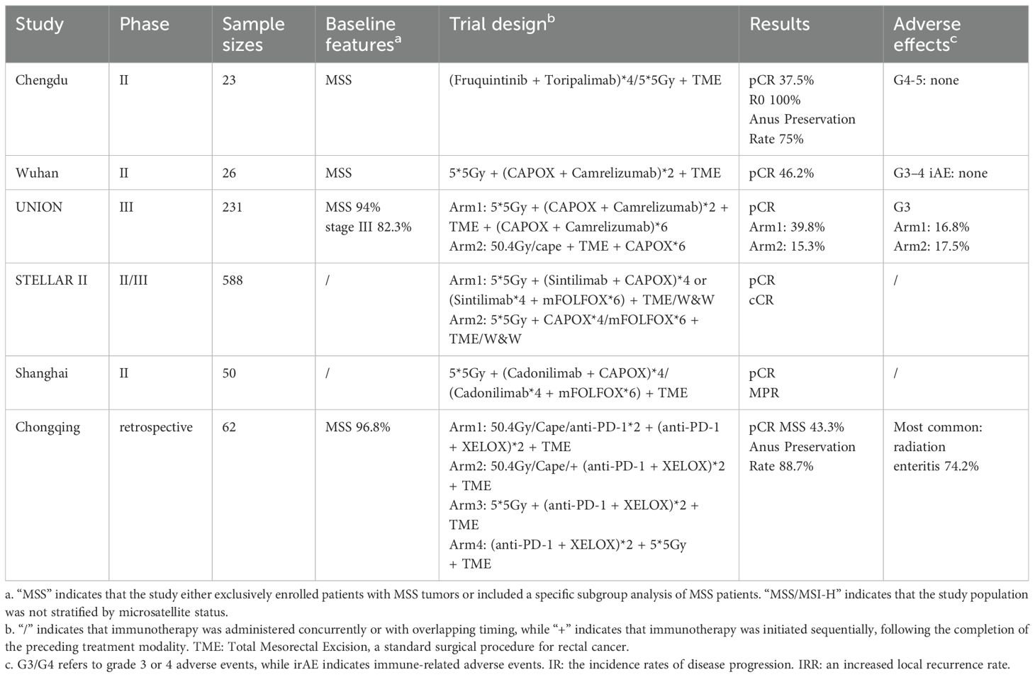 The Prospective, multicenter, randomized, Phase II TORCH study (58), published in the same year, employed a pick-the-winner design and enrolled eligible patients diagnosed with clinical T3–T4 and/or N1 stage rectal adenocarcinoma. Patients were randomized into Groups A and B. Group A received SCRT followed by six cycles of capecitabine, oxaliplatin, and toripalimab as consolidation immunochemotherapy, while Group B underwent two cycles of induction immunochemotherapy followed by SCRT, with subsequent assignment to either TME or the W&W strategy based on tumor response. Among the 130 enrolled patients, 121 were identified as having the pMMR/MSS subtype (62 in Group A and 59 in Group B). At a median follow-up of 19 months, the CR rates for Groups A and B were 56.5% and 54.2%, respectively, both significantly exceeding the predefined statistical hypothesis (p < 0.001). The pCR rate was 50% in both groups. Fifteen patients in each group selected the W&W strategy and remained disease-free. The most frequently reported grade III–IV adverse events included thrombocytopenia and neutropenia. Patients in Group A exhibited a higher cCR rate at restaging (43.5% vs. 35.6%) and a lower incidence of grade III–IV thrombocytopenia during neoadjuvant therapy (24.2% vs. 33.9%). The CR rates achieved in the TORCH trial were substantially higher than the pCR or CR rates reported in the experimental arms of the RAPIDO (44) or STELLAR (46) trials. The most plausible explanation currently proposed is that the addition of immunotherapy contributed to enhanced tumor regression.