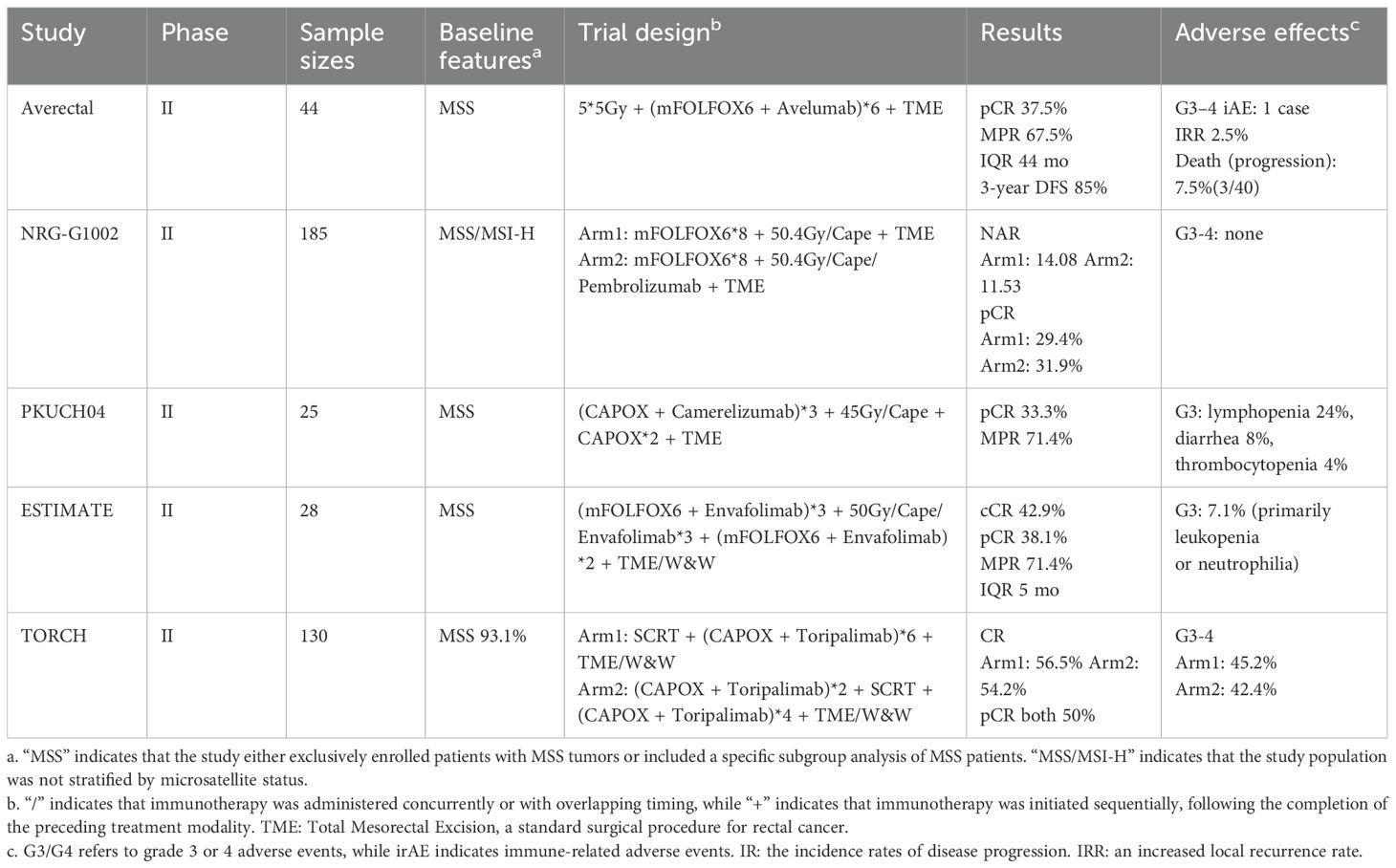 In the 2020 open-label, single-arm, multicenter Phase II Averectal study (53), recruitment was planned for 44 patients. During the first phase, 13 patients with the pMMR/MSS subtype received SCRT in combination with six cycles of mFOLFOX6 chemotherapy and avelumab. Except for one patient who withdrew from the study prior to TME due to disease progression, all remaining participants completed the treatment protocol as scheduled. Results from the initial phase demonstrated that three patients (25%) achieved pCR. Final outcomes from the Averectal study (54) were presented at the 2024 ESMO GCC conference. Of the 44 patients enrolled, 40 completed the treatment and were included in the final analysis, with a median follow-up duration of 44 months (range: 11.4–51.4). Among these patients, 15 (37.5%) achieved pCR. The mean DFS was 42 months (range: 37.9–46.1), while the mean OS was 46.3 months (range: 44.4–48.2). However, median values for DFS and OS had not yet been reached. The 3-year DFS rate was 85%, and the local recurrence rate was 1 out of 40 patients (2.5%). Three patients died as a result of disease progression.