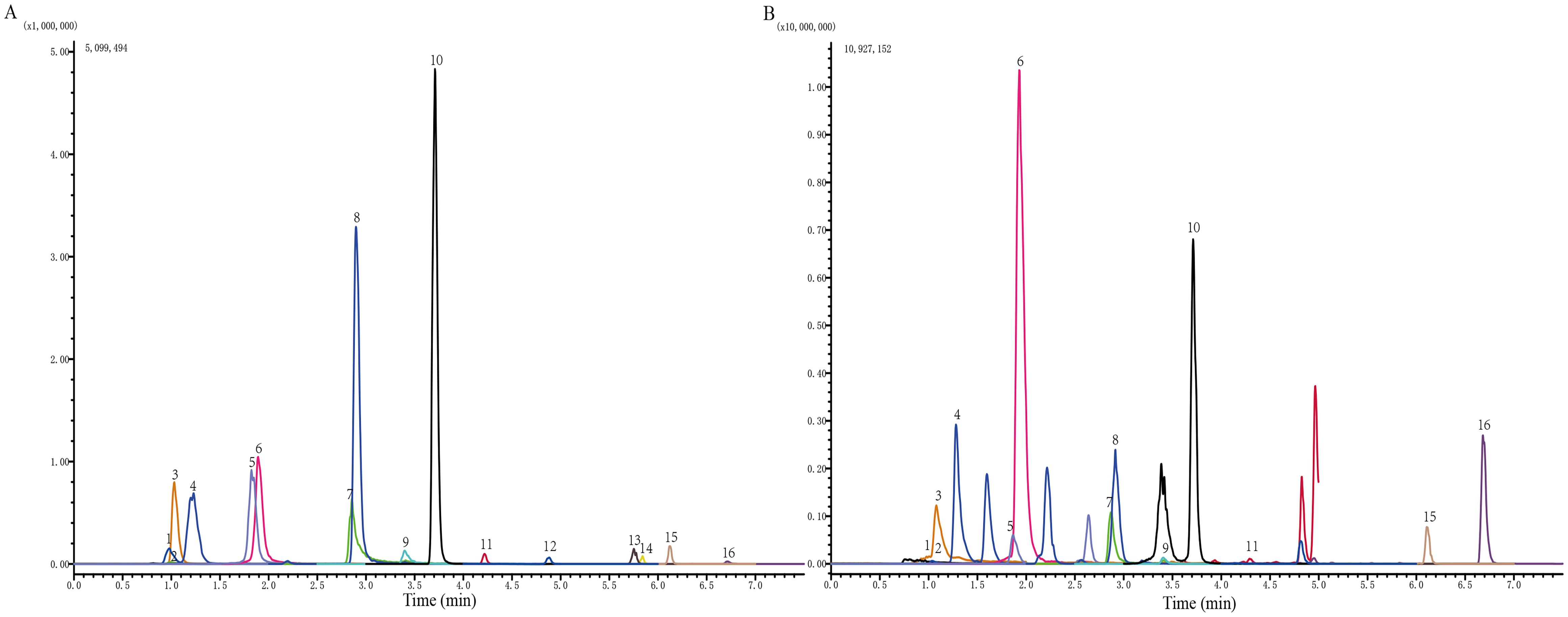 Figure 1. Identification of the chemical components of JPZS. (A) Standard product; (B) JPZS. The main components identified are as follows: 1. catechin, 2. gallic acid, 3. 5-hydroxymethylfurfural, 4. acteoside, 5. rutin, 6. hyperoside, 7. quercetin, 8. tiliroside, 9. kaempferol, 10. formononetin, 11. atractylenolide III, 12. astragaloside A, 13. dioscin, 14. atractylodin, 15. pachymic acid, and 16. atractylone.