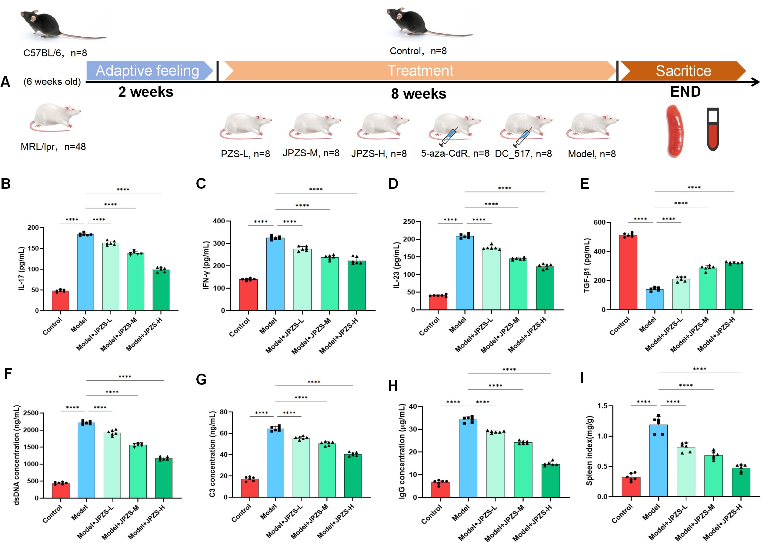 Figure 2. The JPZS treatment improves MRL/lpr mice disease development. (A–D) The effect of JPZS on the levels of serum cytokines TGF-β, IFN-γ, IL-17, and IL-23 in each group of mice. (E) The effect of JPZS on serum dsDNA levels in various groups of mice. (F) The effect of JPZS on serum C3 levels in each group of mice. (G) The effect of JPZS on serum anti-IgG levels in various groups of mice. (H) The effect of JPZS on the spleen index of mice in each group. (I) The effect of JPZS on the spleen index of mice in each group (Groups are the same as B-E). ****P<0.0001.