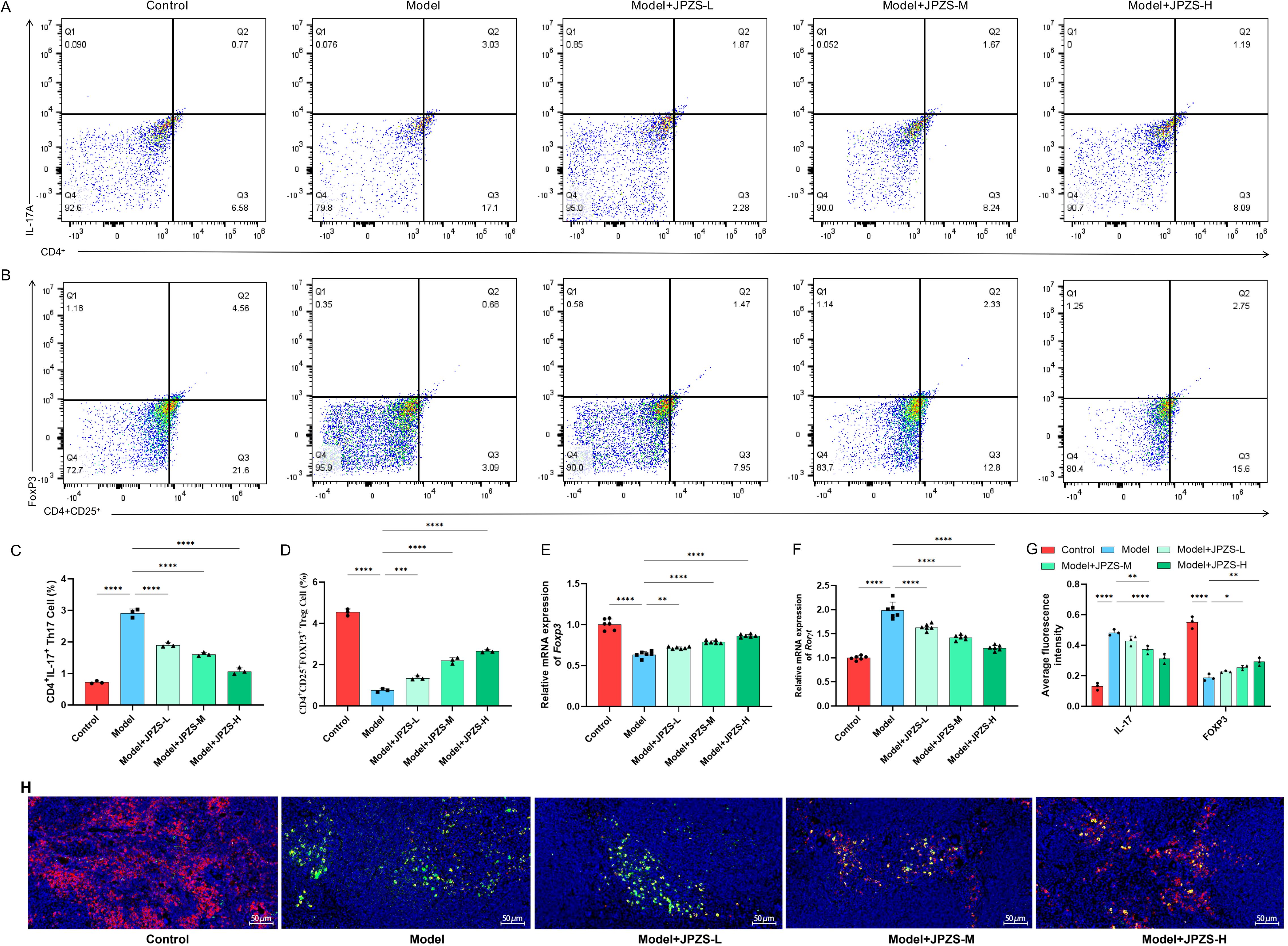 Figure 3. Effects of JPZS treatment on Th17 and Treg cell balance. (A, B) The effect of JPZS on the distribution of Tregs and Th17 cell subsets in peripheral blood CD4+ T cells of MRL/lpr mice indicated by flow cytometry analysis. (C) Quantitative histogram of Th17 cell frequency. (D) Tregs cell frequency quantification bar chart. (E, F) The effect of JPZS on the transcription levels of Foxp3 and RORγt mRNA in the peripheral blood CD4+ T cells of MRL/lpr mice. (G) Immunofluorescence quantitative bar charts of FOXP3 and IL-17A in the spleen of mice in each group. (H) Immunofluorescence staining of spleen FOXP3 and IL-17A in each group of mice (scale: 50 μm; IL-17A: green; FOXP3: red). ****P<0.0001, ***P<0.001, **P<0.01, *P<0.05.