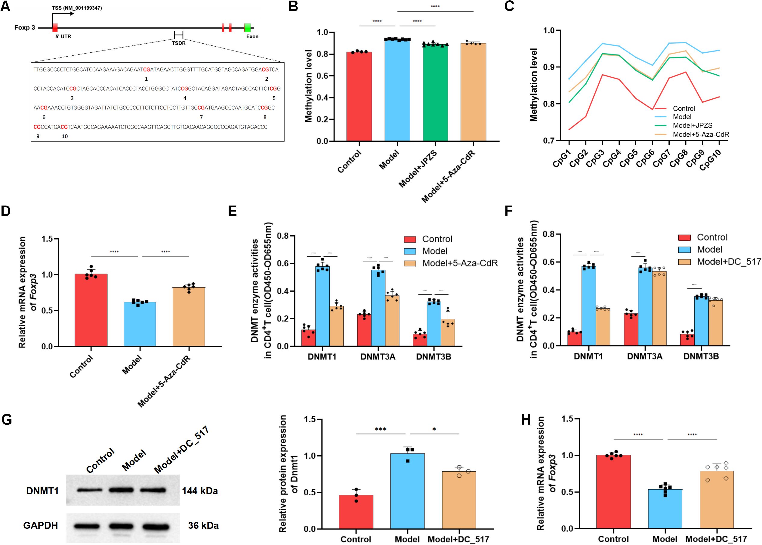 Figure 4. DNA methylation levels of Foxp3 in the CD4+ T cells of MRL/lpr mice and the reducing effect of JPZS. (A) CPG islands of Foxp3-TSDR in CD4+ T cells of MRL/lpr mice. (B) The effects of JPZS and 5-aza-CdR on the Foxp3 methylation levels in CD4+ T cells. (C) The effect of JPZS and 5-aza-CdR on the methylation levels of 10 CPG islands in the CD4+ T cells Foxp3. (D) The transcription level of Foxp3 mRNA after 5-aza-CdR treatment. (E) Methyltransferase Dnmt1, Dnmt3a, and Dnmt3b activities were noted in the CD4+ T cells treated with 5-aza-CdR. (F) Methyltransferase Dnmt1, Dnmt3a, and Dnmt3b activities were observed in the CD4+ T cells treated with DC_517. (G) The expression level of the Dnmt1 protein after DC_517 treatment. (H) The transcription level of Foxp3 mRNA after DC_517 treatment. ****P<0.0001, ***P<0.001, *P<0.05.