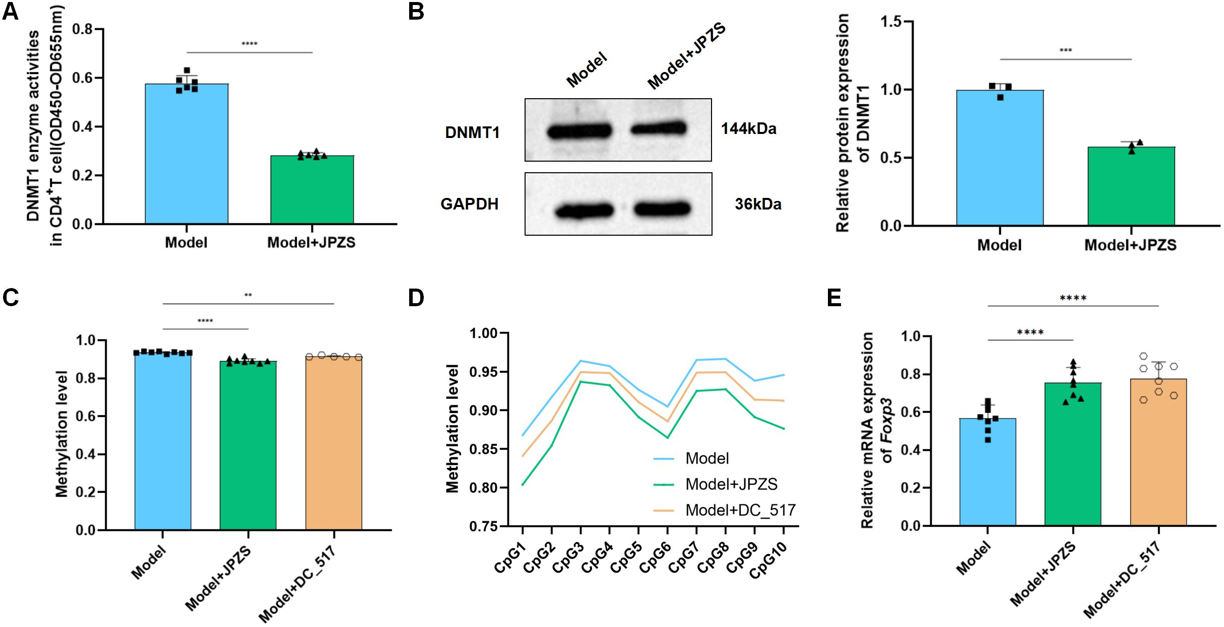 Figure 5. DNMT1-mediated Foxp3-TSDR methylation and reduction of JPZS. (A, B) The effect of JPZS on Dnmt1 activity and protein expression levels. (C) The effects of JPZS and DC_517 on Foxp3 methylation levels in CD4+ T cells. (D) The effects of JPZS and DC_517 on the methylation levels of 10 CpG islands in CD4+ T cells Foxp3. (E) The effect of JPZS and DC_517 on the transcription level of Foxp3 mRNA in the peripheral blood CD4+ T cells of MRL/lpr mice. ****P<0.0001, ***P<0.001, **P<0.01.