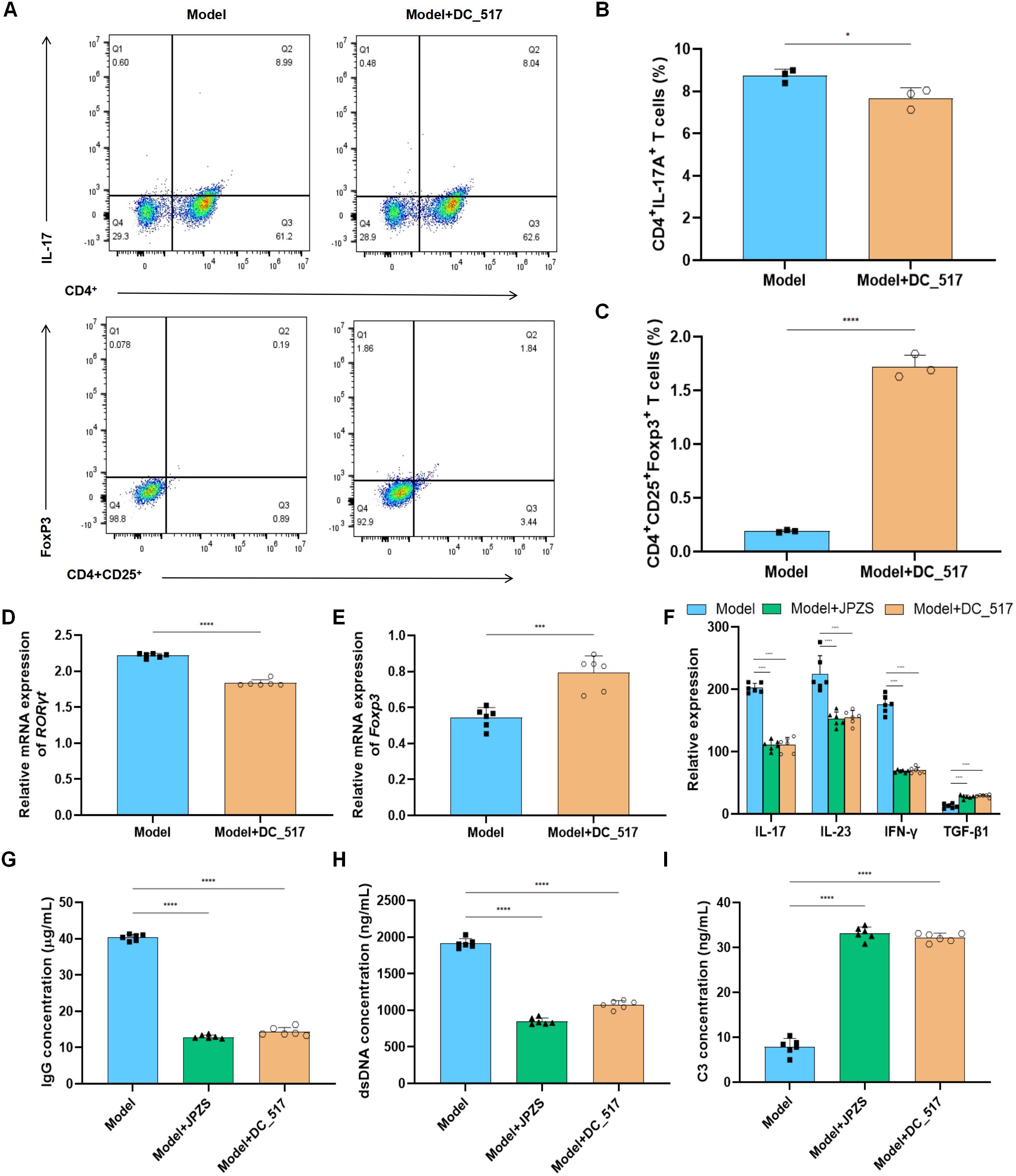 Figure 6. JPZS promotes Treg/Th17 balance by inhibiting DNMT1-mediated Foxp3 methylation. (A) The frequency of Th17 cells and Treg cells in splenocytes was denoted by flow cytometry analyses. (B, C) The effects of JPZS and DC_517 on the transcription levels of Foxp3 and RORγt mRNA in CD4+ T cells. (D) Effects of JPZS and DC_517 on serum cytokine levels in MRL/lpr mice. (G–I) The effects of JPZS and DC_517 on the levels of IgG, dsDNA, and C3 in the serum of MRL/lpr mice. ****P<0.0001, ***P<0.001, *P<0.05.