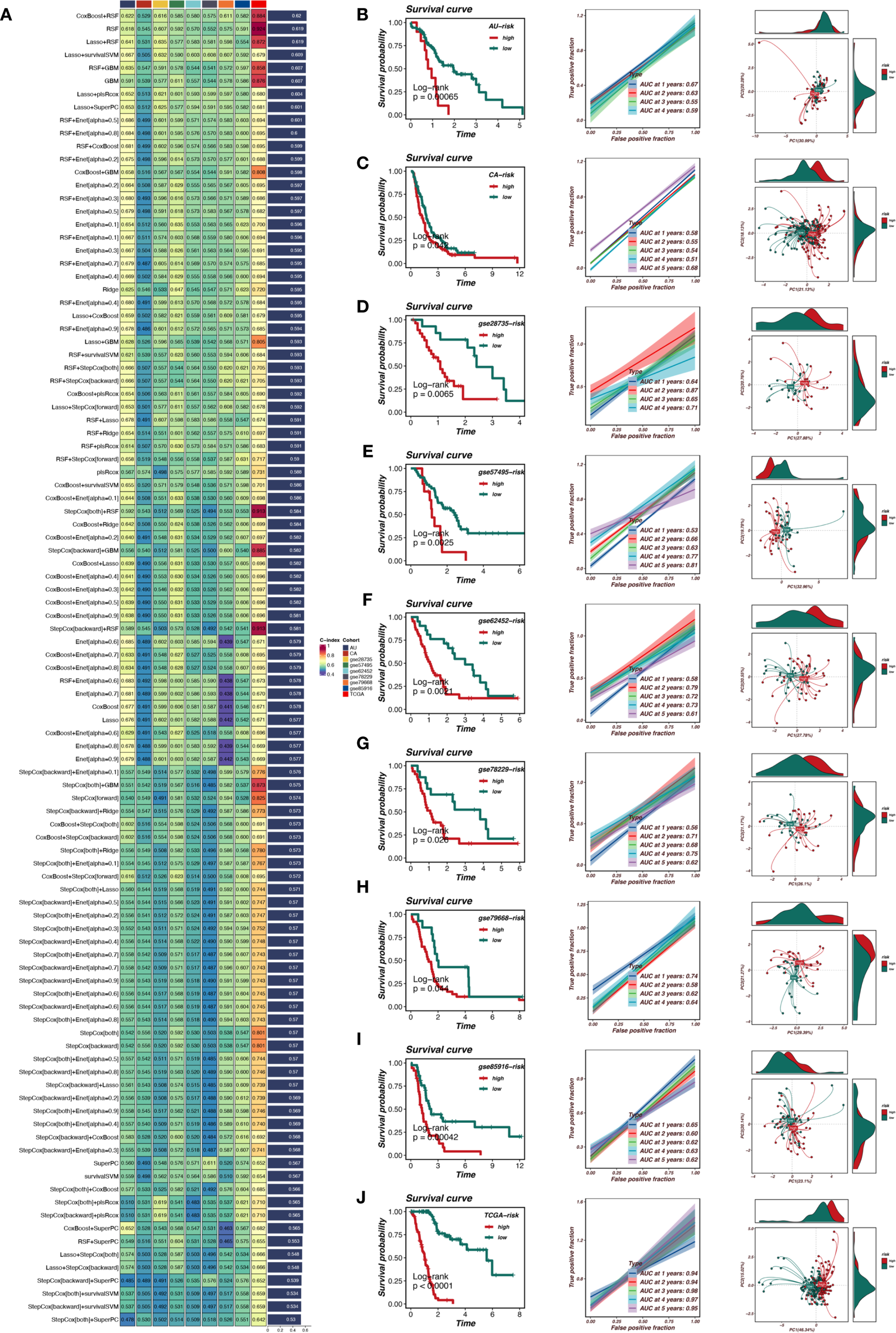 Heatmap and multiple plots of a study on survival analysis. The heatmap on the left displays model accuracies in different cohorts, color-coded from blue to red. Panels B to J contain survival curves, ROC curves, and scatter plots showing performance metrics with clear distinctions between high and low-risk groups. Log-rank tests and AUC values are noted, indicating statistical significance and prediction accuracy over time.