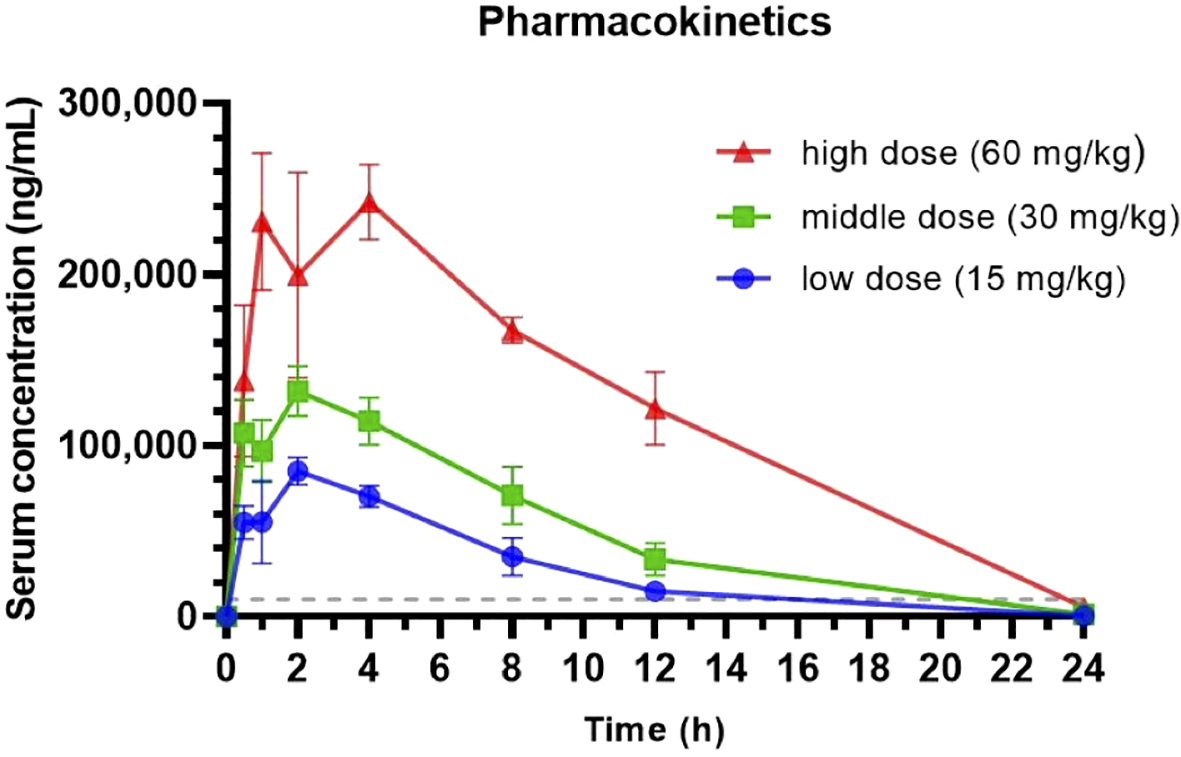 Drug administration and blood sampling in Syrian hamsters were performed by Viroclinics Xplore (Schaijk, the Netherlands) and are described in the sections “Drug administration” and “Sampling after inoculation”. Specifically, at different time points (0, 0.5, 1, 2, 4, 8, 12, and 24 h) after the administration of a single dose of zapnometinib (15, 30, or 60 mg/kg per oral (p.o.)), ~200 µL blood was collected retro-orbitally from three animals per time point per dose and alternating animals between time points (except at 24 h, n = 6 per group) under isoflurane anesthesia using a heparinized capillary tube containing a clot activator (Microvette 500 Z-Gel, Sarstedt). Serum was collected by centrifuging the tubes at 4000 x g for 10 min, aliquoted, and stored at < -70°C until pharmacokinetic analysis. Daily clinical observations included monitoring of signs such as ruffled fur, hunched back posture, accelerated breathing and lethargy, and the body weight was monitored before and 24 h post administration.