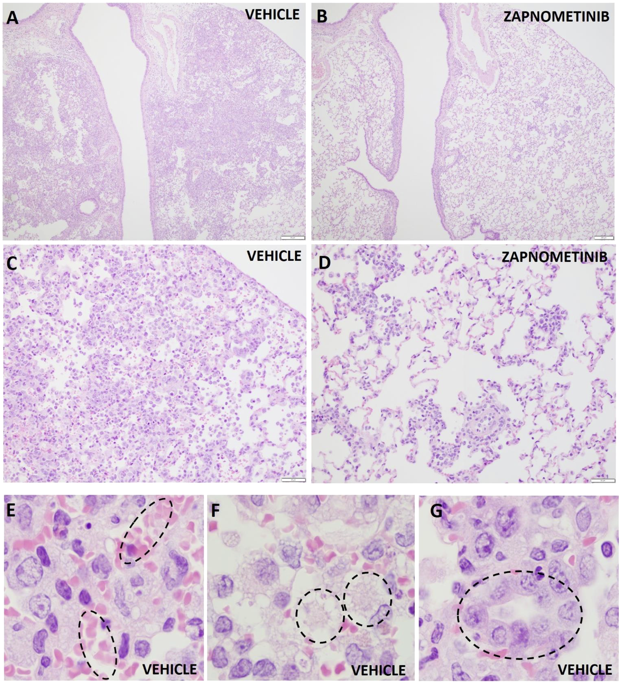 Figure 4. Histopathologic changes in the lungs of hamsters infected with SARS-CoV-2. Representative histopathologic changes at 4 dpi in the lungs of hamsters infected with SARS-CoV-2 and treated with zapnometinib beginning at +24 h p.i. (B, D) or treated with the vehicle only (A, C, E, F, G). Haemorrhage (E), edema (F) and type II pneumocyte hyperplasia (G) were observed in the vehicle only animals (shown in dashed circles). Hematoxylin and eosin staining; 40x magnification (A, B), 200x magnification (C, D) and 1000x (E–G).