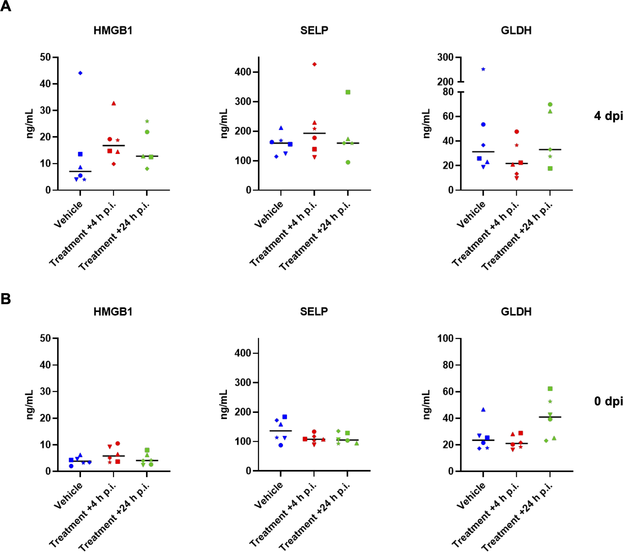 Figure 5. Candidate safety biomarker analysis. The levels of candidate biomarkers in serum samples from hamsters collected (A), at 4 dpi after infection and zapnometinib treatment and (B), before infection with SARS-CoV-2 (0 dpi, prior to infection and zapnometinib treatment) and were analysed by IA-LC-MS/MS. High mobility group box 1 protein (HMGB1, an indicator of necrosis), glutamate dehydrogenase (GLDH, an indicator of liver damage), and p-selectin (SELP, an indicator of endothelial damage) levels in the zapnometinib-treated and vehicle-treated groups are shown. The treatment conditions described below the graphs refer to the treatment that the animals received after infection. Individual data (different symbols) and median values are presented. The number of animals per group was as follows: n(Vehicle) = 6; n(Treatment +4 h p.i.) = 6; n(Treatment +24 h p.i.) = 5. The data were analysed by one-way ANOVA. P values < 0.05 were considered statistically significant.