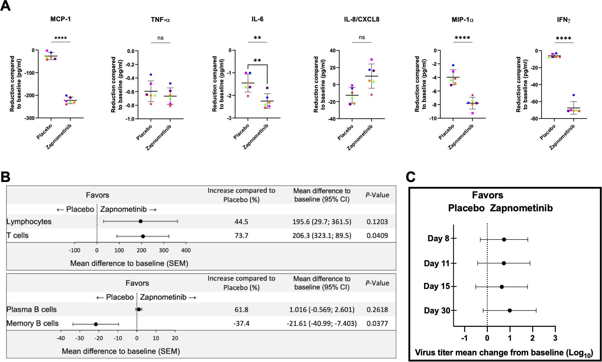 Figure 7. Immunomodulating effects and viral load analysis of patients hospitalized with COVID-19 and treated with either zapnometinib or placebo for 6 days. (A) Reduction of cytokine and chemokine expression compared to baseline values. Analysis was performed with blood from 6 patients from each group using Meso Scale V-Plex. All of them received either no standard of care treatment or antiviral treatment. Patients that received glucocorticoids as standard of care were excluded. Analysis was performed with values from the complete observation period (until day 30), horizontal line showing the mean value ± SEM of all days. Colour and symbols represent the mean values of n = 6 patients on different days: • blue circle = day 3, pink square = day 5; green triangle = day 8; orange rhombus = day 11, aubergine-coloured hexagon = day 15, red star = day 30 ▲. Analysis was performed using a one-tailed t-test. **p < 0.01; ****p < 0.0001. (B) Mean difference ± SEM of the number of lymphocytes, T cells, Plasma B cells and Memory B cells compared to baseline in zapnometinib (n = 34) and placebo treated (n = 34) patients. The graphics represent values from the entire study period (D1, D3, D5, D8, D11, D15 and D30). The data were analysed by one-tailed t-test. (C) RNA virus titer mean change from baseline over time in SARS-CoV-2 sputum samples from hospitalized COVID-19 patients on D8, D11, D15 and D30. Analysis only includes patients with baseline sputum SARS-CoV-2 RNA titer ≥ 500 copies/ml. Difference of mean change from zapnometinib vs. placebo treatment was given as Log10 copies/ml ± SEM, analysed with unpaired t-test with Welch’s correction. Further details of analysis see Supplementary Table 3.