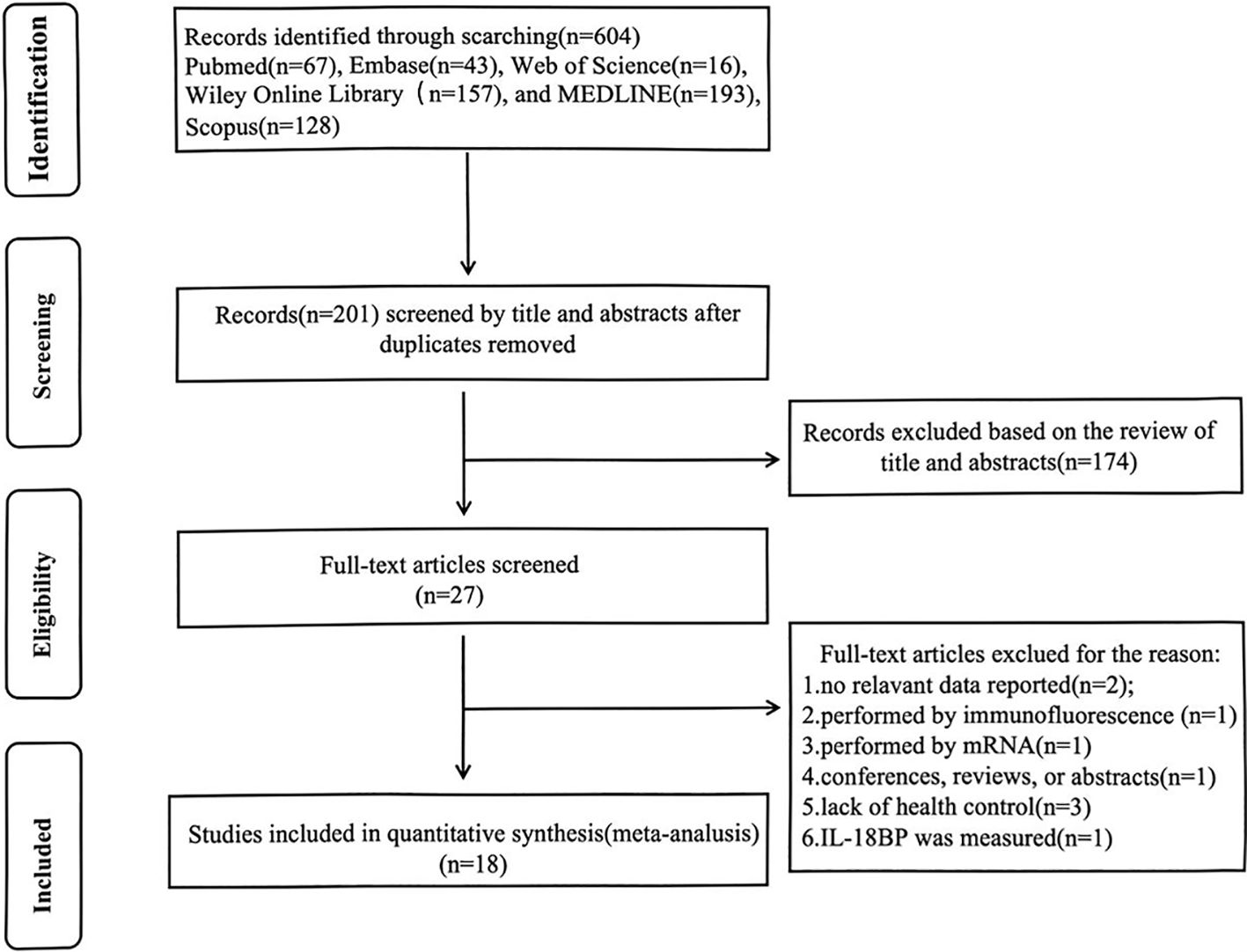 Articles which met the following standards were going to be contained for further data processing: (1) patients diagnosed as LN under a definite standard and matched healthy controls had been recruited; (2) circulating IL-18 level from LN patients and healthy controls were measured and reported either in plasma or serum; (3) study types including the cohort, case–control, and cross section; (4) the content was written in English. There were not any restrictions on ethnicity.