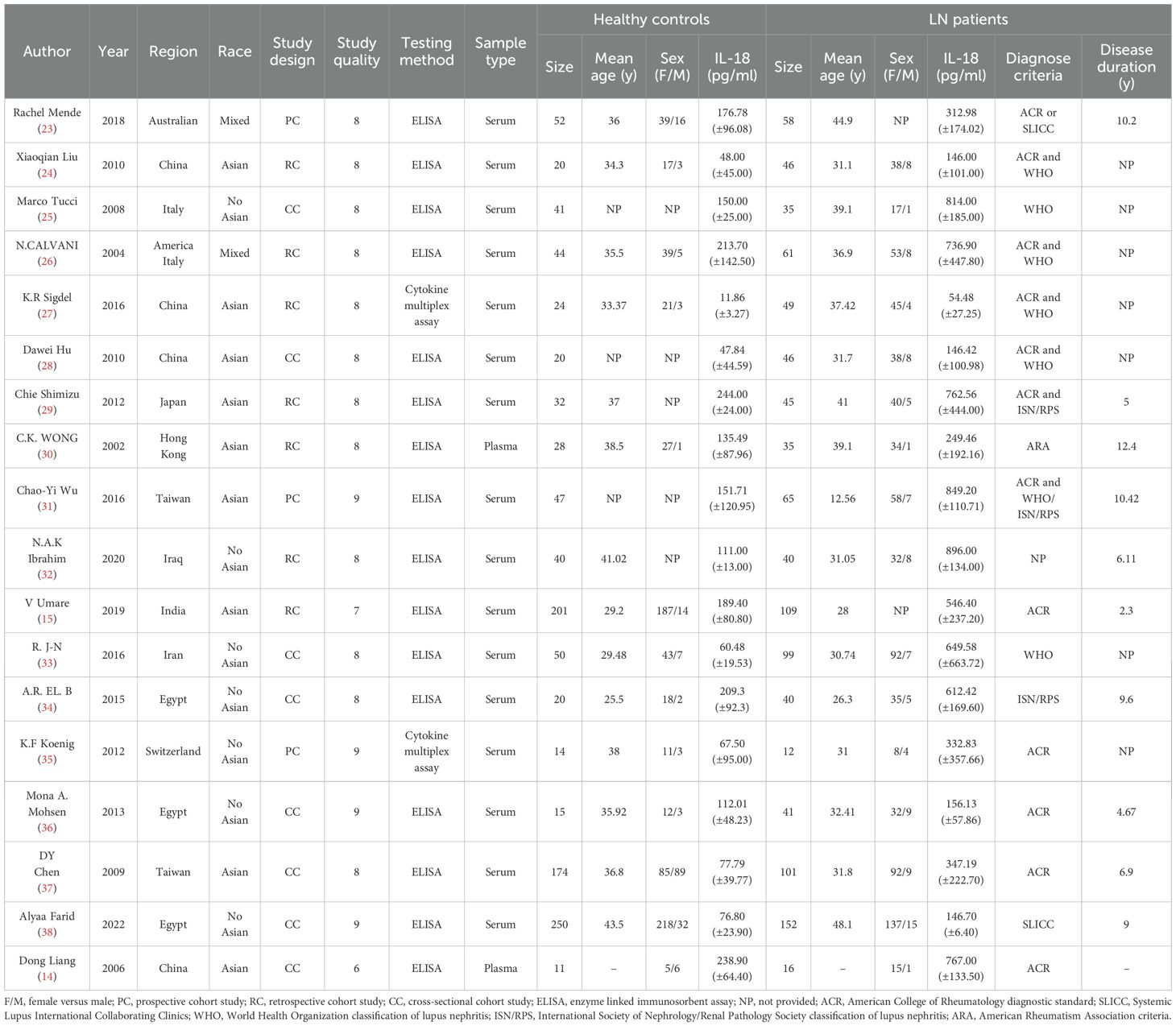 Utilizing the search strategies listed above, a total of 604 studies were retrieved. First, duplicates were removed through title/abstract screening. After full-text review, studies that did not measure IL-18 levels or confirm LN diagnosis were excluded, ultimately identifying 18 articles meeting inclusion criteria. The flowchart of the detailed inclusion and exclusion process is displayed in Figure 1.With sample sizes varying from 26 to 402, a total of 1,033 SLE patients with LN, 537 without LN, and 1,083 normal controls were taken under analysis. These studies were conducted in 12 regions from 2002 to 2022, covering Asian, European, Middle Eastern, American, and North African populations. As for study quality assessment, most of the included studies can be recognized as reliable quality by NOS scale or AHRQ assessment. All relevant information is listed in Table 1 (14, 15, 2338). Of these, 11 studies have analyzed the relationship between IL-18 and LN staging (Supplementary Table S4). After excluding studies with incomplete IL-18 data and those containing single-case pathological staging reports, six studies were ultimately included in the network meta-analysis for LN staging (Supplementary Table S5).