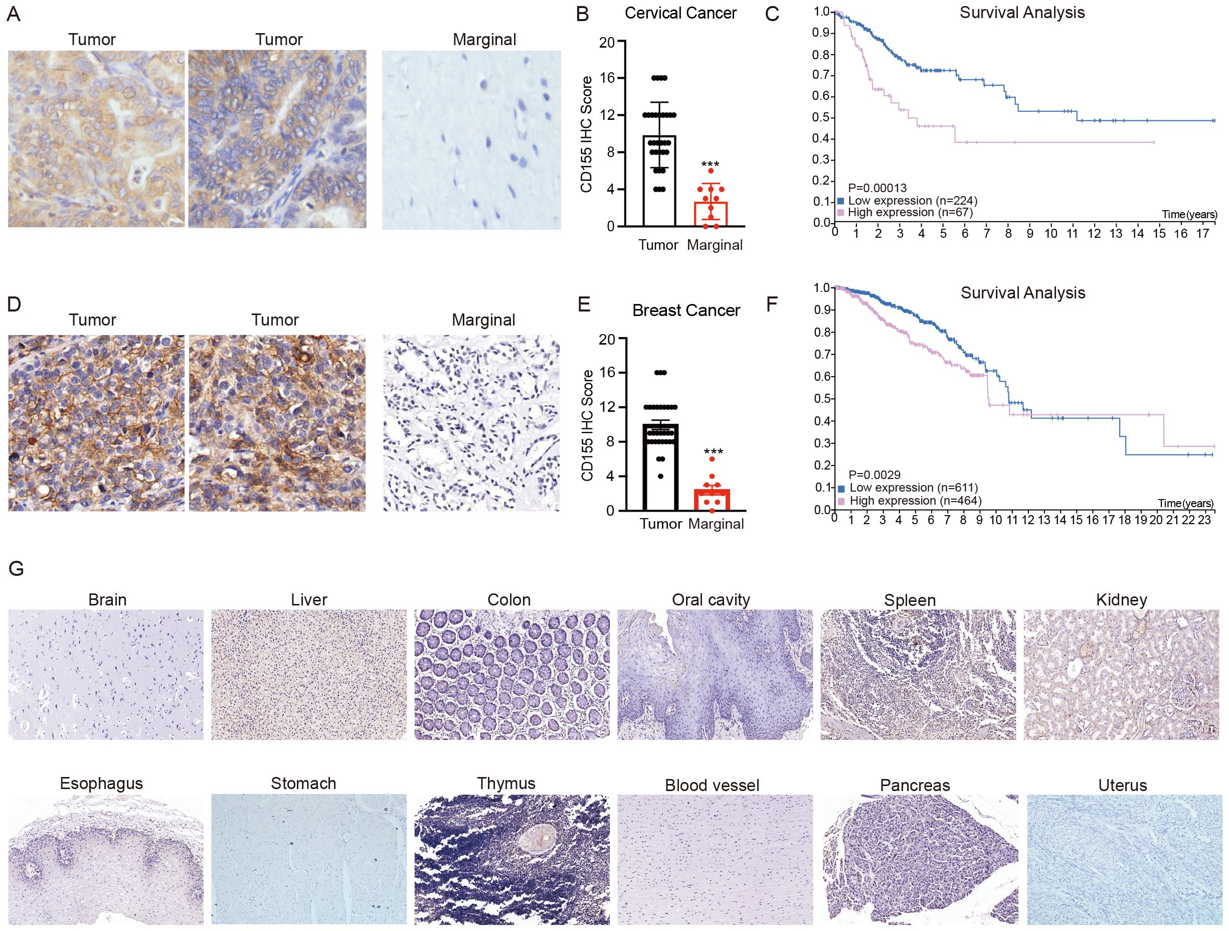 Figure 1. Expression of CD155 in breast cancer, cervical cancer, and normal tissues. (A) Representative immunohistochemistry (IHC) of CD155 in cervical cancer and marginal tissues. Note the specific staining in tumor cells and the absence of signal in adjacent stromal tissue, which serves as an internal negative control. (B) H-scores were generated by multiplying the percentage of cells positive by the intensity seen for each core. H-scores are shown for cervical cancer (tumor = 30, marginal = 10). (C) Survival analysis of cervical cancer patients using The Human Protein Atlas. (D) Representative IHC of CD155 in breast cancer and marginal tissues. Note the specific staining in tumor cells and the absence of signal in adjacent stromal tissue, which serves as an internal negative control. (E) H-scores were generated by multiplying the percentage of cells positive by the intensity seen for each core. H-scores are shown for breast cancer (tumor = 30, marginal = 30). (F) Survival analysis of breast cancer patients using The Human Protein Atlas. (G) Representative IHC staining for CD155 expression in normal tissues. ***p < 0.001.