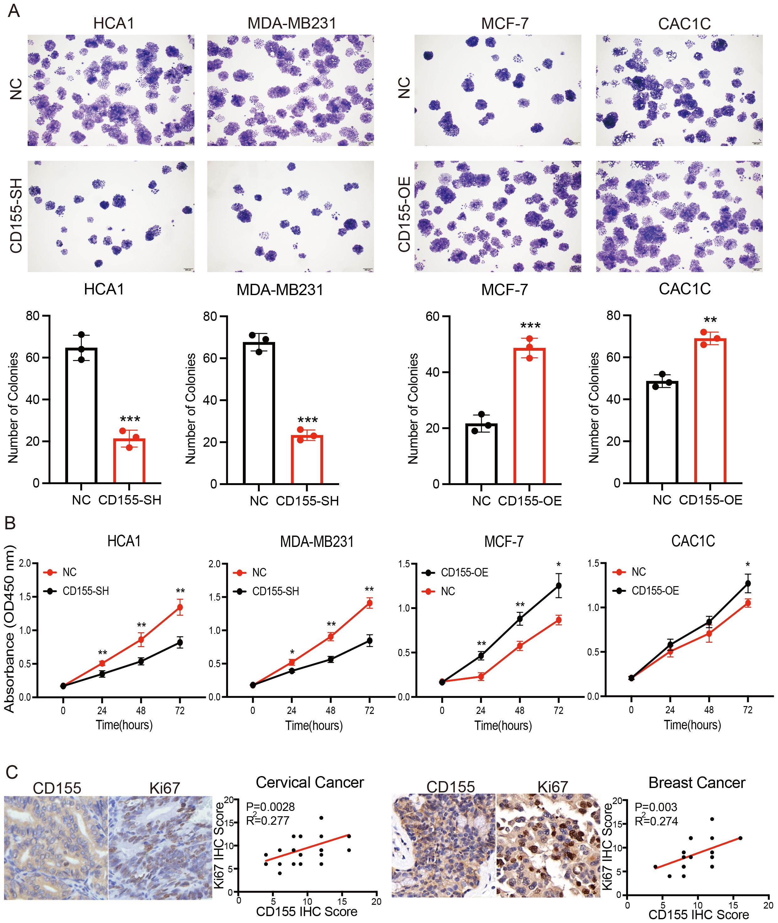 Figure 2. Expression of CD155 promotes breast and cervical cancer progression by increasing tumor cell proliferation. (A) Colony formation assay performed in breast and cervical cell lines (n = 3). (B) CCK-8 assay performed in breast and cervical cell lines (n = 3). (C) Immunohistochemistry (IHC) analysis showing the correlation between the expression of CD155 and Ki67 in cervical and breast cancer (n = 30). *p < 0.05; **p < 0.01; ***p < 0.001.