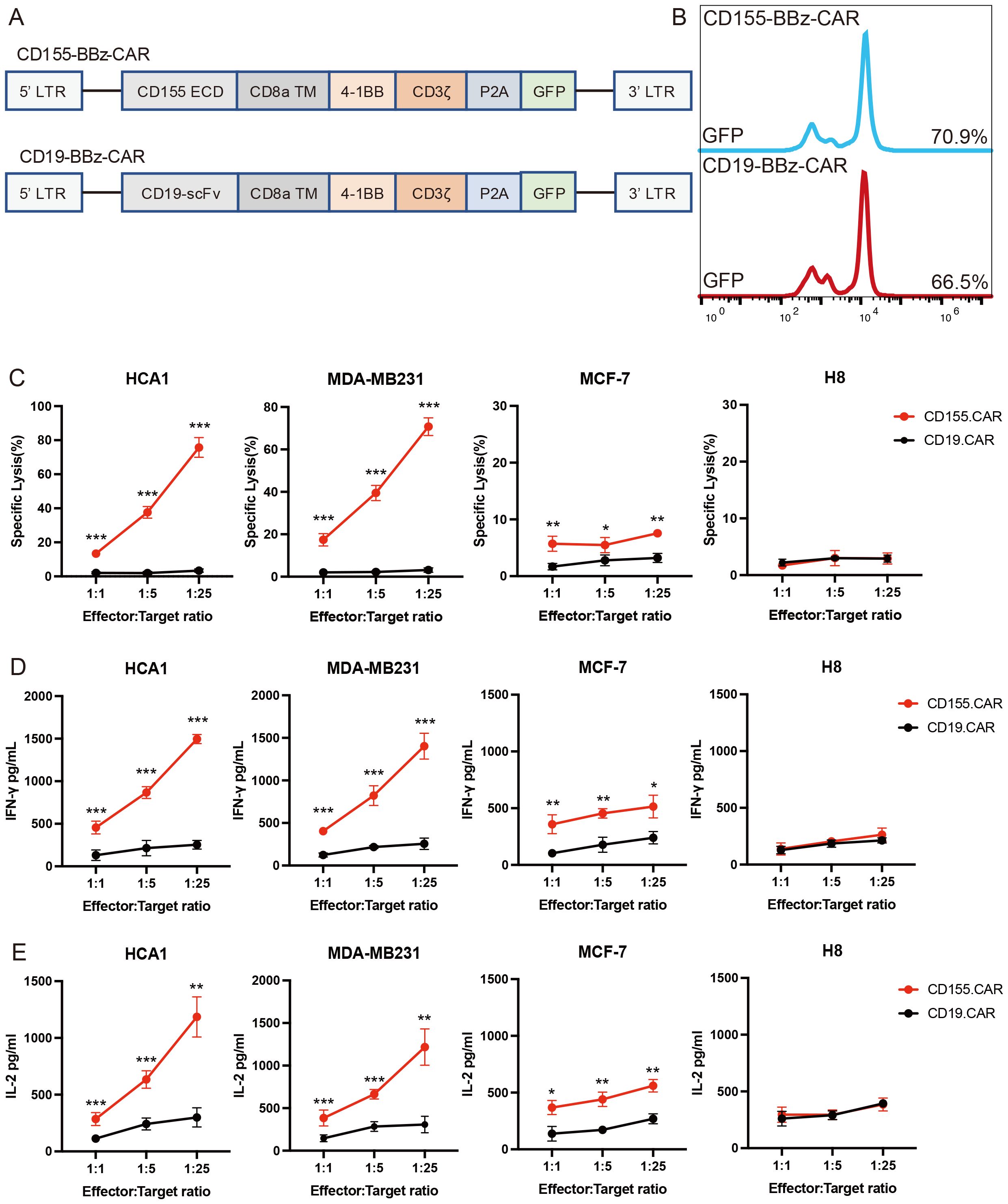Figure 3. CD155.CAR T cells target CD155+ breast and cervical cell lines in vitro. (A) Retroviral constructs of chimeric antigen receptors (CARs). (B) Percentage of green fluorescent protein (GFP) that transduced primary human T cells after 2 weeks detected by flow cytometry. (C) Primary T cells from healthy donors transduced with the indicated lentivirus co-incubated with tumor cell lines at varying effector-to-target (E/T) ratios for 12 (h) Cell lysis was determined with the lactate dehydrogenase (LDH) release assay (n = 3). (D) IFN-γ secretion levels of the T cells co-cultured with target cells for 12 h measured using an ELISA kit (n = 3). (E) IL-2 secretion levels of the T cells co-cultured with target cells for 12 h measured with an ELISA kit (n = 3). *p < 0.05; **p < 0.01; ***p < 0.001.
