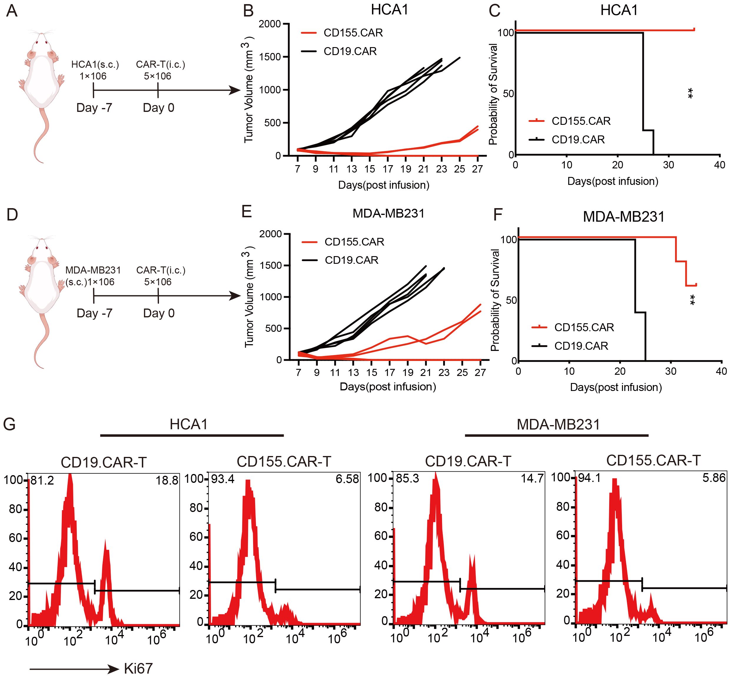 Figure 4. Antitumor efficacy of CD155.CAR T cells in vivo. (A) Schematic representation of the cervical cancer xenograft model. (B) Growth curve of the HCA1 xenografts treated with the indicated T cells (n = 5). (C) Survival analysis of the mice in the two groups (n = 5). (D) Schematic representation of the breast cancer xenograft model. (E) Growth curve of the MDA-MB231 xenografts treated with the indicated T cells (n = 5). (F) Survival analysis of the mice in the two groups (n = 5). (G) Representative flow cytometry images with Ki67. Tumor tissues were harvested 14 days after the indicated T-cell infusion. **p < 0.01.