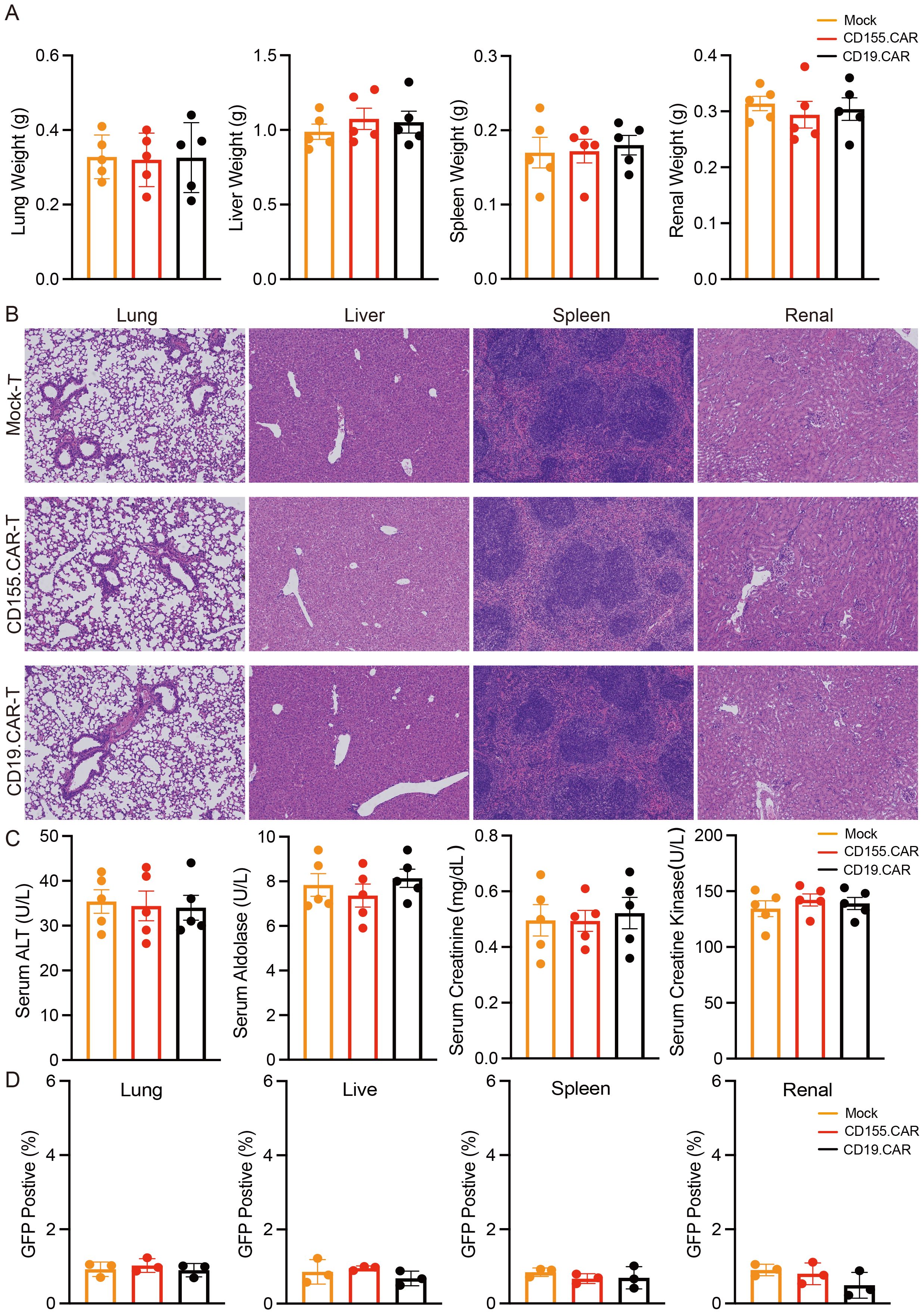 Figure 5. CD155.CAR T cells show a good safety profile in mice. (A) Weights of the liver, spleen, lung, and kidneys (n = 5). (B) H&E staining of the indicated organs. (C) Serum chemistry analysis for the activity of serum aldolase, alanine aminotransferase (ALT), and creatine kinase (CK) and for creatinine (n = 5). (D) Flow cytometry staining of the lung, liver, spleen, and kidneys of mice with green fluorescent protein (GFP) to detect CAR T-cell infiltration.