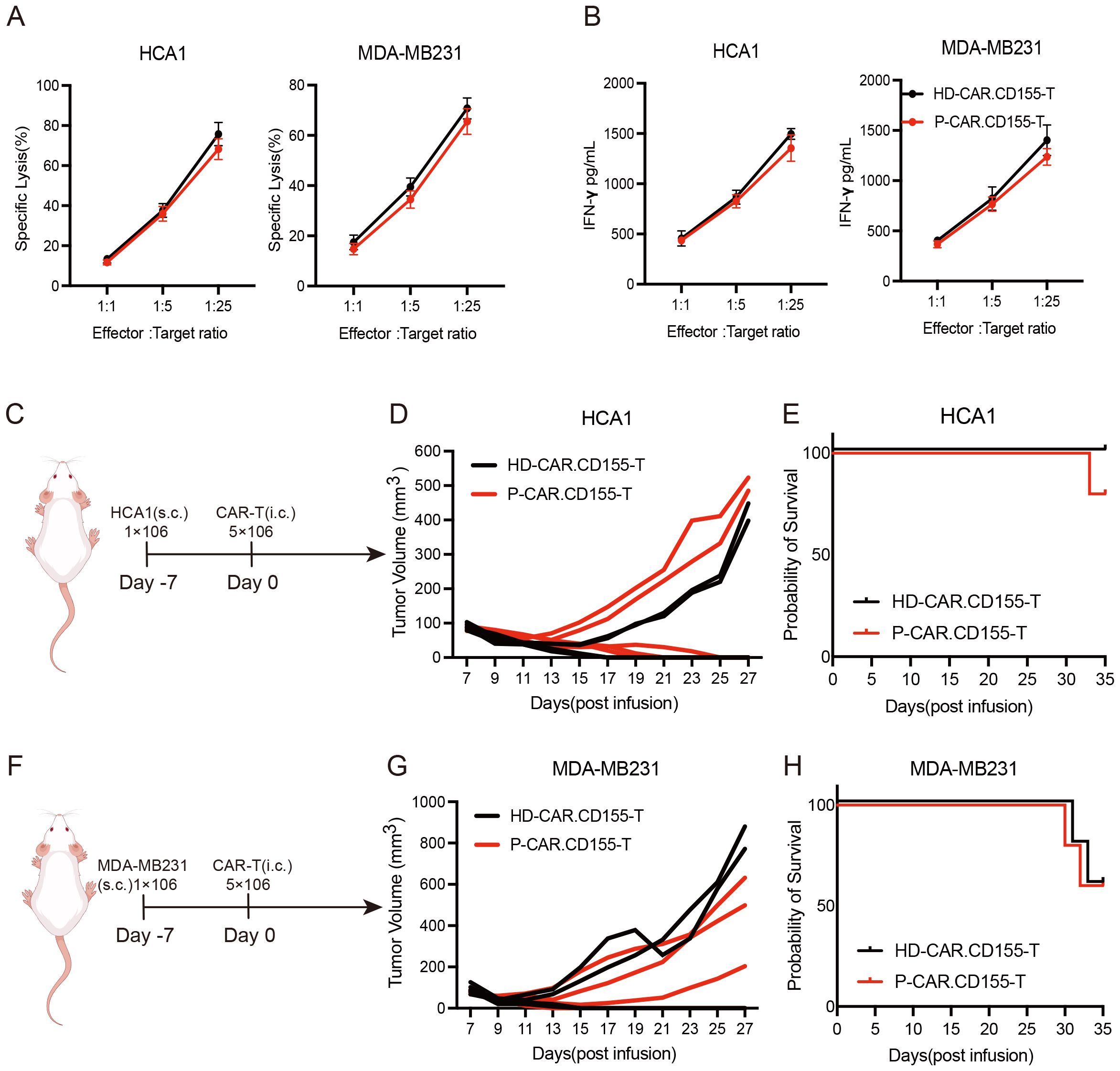 Figure 6. Patient-derived CD155.CAR T cells potently suppress breast and cervical cancer both in vitro and in vivo. (A) Primary T cells from healthy donors or patients transduced with the indicated lentivirus co-incubated with tumor cell lines at varying effector-to-target (E/T) ratios for 12 (h) Cell lysis was determined with the lactate dehydrogenase (LDH) release assay (n = 3). (B) IFN-γ secretion levels of the T cells co-cultured with target cells for 12 h measured with an ELISA kit (n = 3). (C) Schematic representation of the cervical cancer xenograft model. (D) Growth curve of the HCA1 xenografts treated with the indicated T cells (each line represents the tumor growth curve of an individual mouse, n = 5). (E) Survival analysis of the mice in the two groups (n = 5). (F) Schematic representation of the breast cancer xenograft model. (G) Growth curve of the MDA-MB231 xenografts treated with the indicated T cells (each line represents the tumor growth curve of an individual mouse, n = 5). (H) Survival analysis of the mice in the two groups (n = 5).