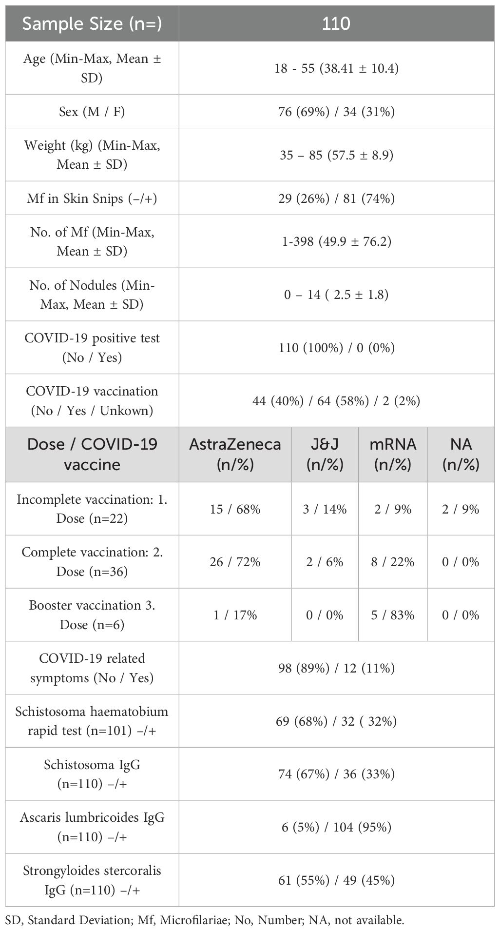 Conclusion: The study concluded that COVID-19 vaccines trigger a strong humoral immune response despite underlying onchocerciasis infection. However, parasitic status or microfilaria load may dampen vaccine-induced responses. These findings highlight the complexity of investigating vaccine responses in the presence of an undeterminable infection history, co-infections and polyparasitism in helminth-endemic areas and emphasize the need to further explore parasite-immunomodulatory mechanisms on COVID-19 vaccine efficacy for future vaccine development.