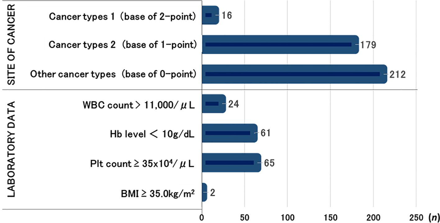 The Khorana score was calculated based on cancer type: 2 points were added for gastric and pancreatic cancer (cancer types 1), while 1 point was added for lung cancer, gynecological cancer, urothelial cancer, and lymphoma (cancer types 2), and biomarkers, such as WBC count, Plt count, Hb level, or use of erythropoiesis-stimulating agents, and BMI scored 1 point each. A score of 0 indicates low risk, 1–2 indicates intermediate risk, and ≥ 3 was classified as high risk (2).