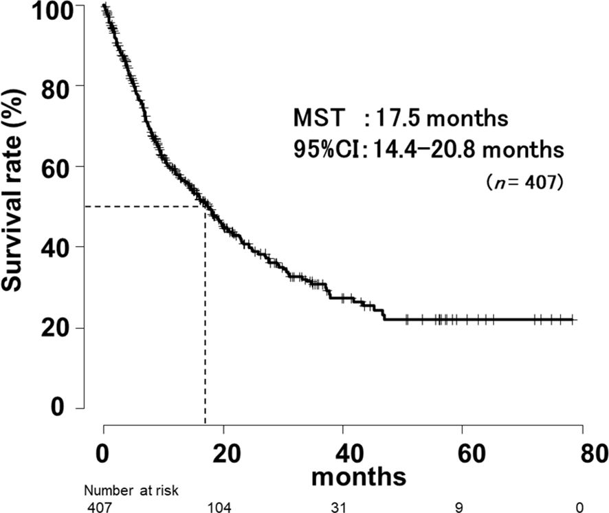 In this study, the mean follow-up period was 15.1 months (range, 0.16-72.0 months) after the first dose of ICI. OS for all patients is shown in Figure 3. The median survival time (MST) was 17.5 months (95% CI, 14.4-20.8 months).