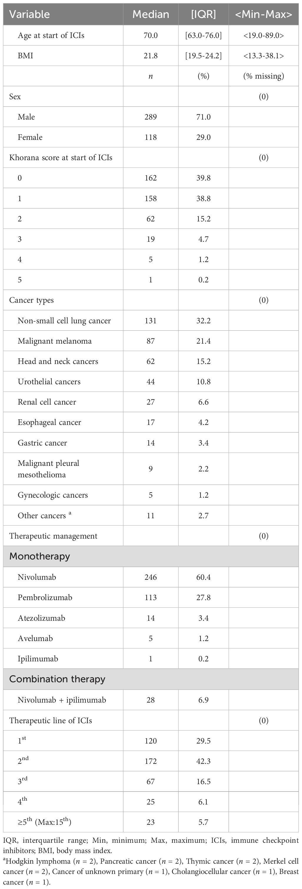 Patients treated with ICIs at Shinshu University Hospital between September 1, 2014, and October 31, 2021, were retrospectively enrolled in this study. To ensure a minimum observation period of 6 months, the data cutoff was set as June 30, 2022. The list of patients was extracted from the medication history database of our hospital pharmacy department. The eligibility criterion was at least one cycle of ICI treatment at our institution, including monotherapy as well as ICI combination therapy. Patients who received cytotoxic anticancer drugs or molecular targeting agents in combination with ICIs were excluded. Baseline clinical information and laboratory data were defined as those determined within 2 weeks prior to commencement of ICI treatment. A total of 407 patients met these criteria and were included in the analysis (Figure 1).